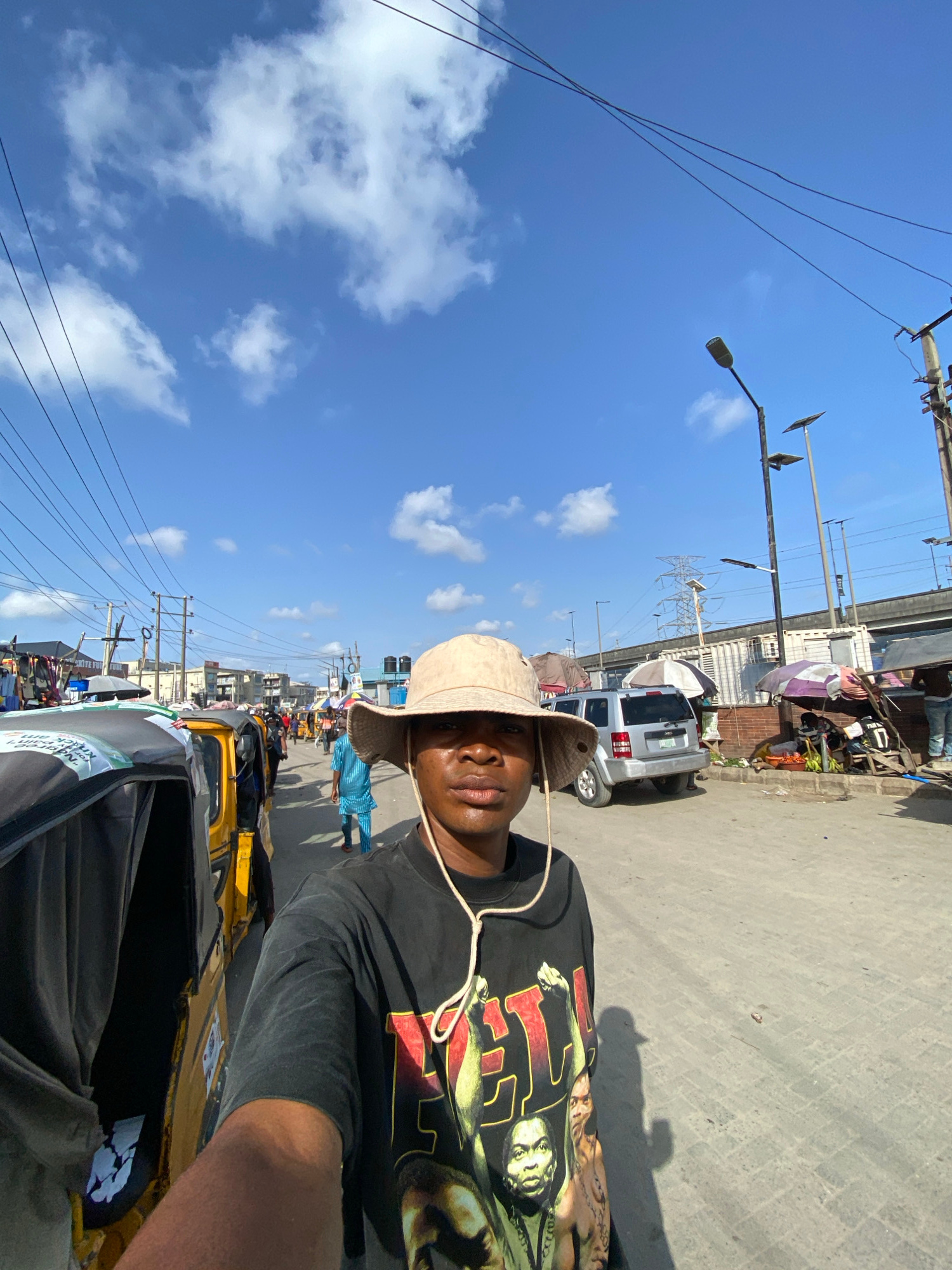 The image, taken in Lekki, Nigeria, shows an individual with dark skin, wearing a bucket hat and a black t-shirt with a graphic print. The person is likely riding in a "keke," a type of auto-rickshaw.…read more