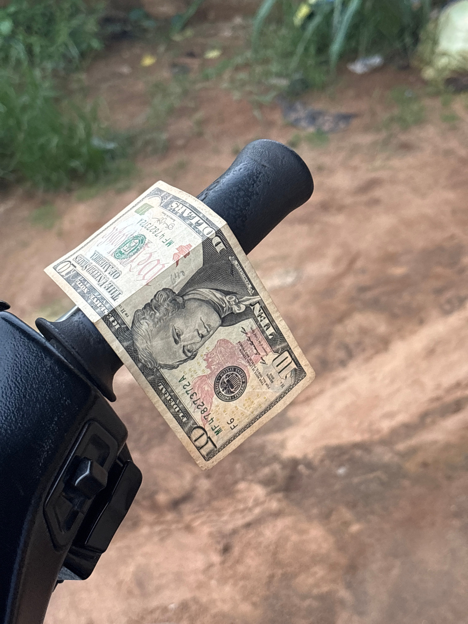 A ten-dollar bill is folded and placed over a black apparatus, possibly a lever or part of a machine. The bill shows a portrait of Alexander Hamilton and has the serial number MF47827372A. The backgro…read more