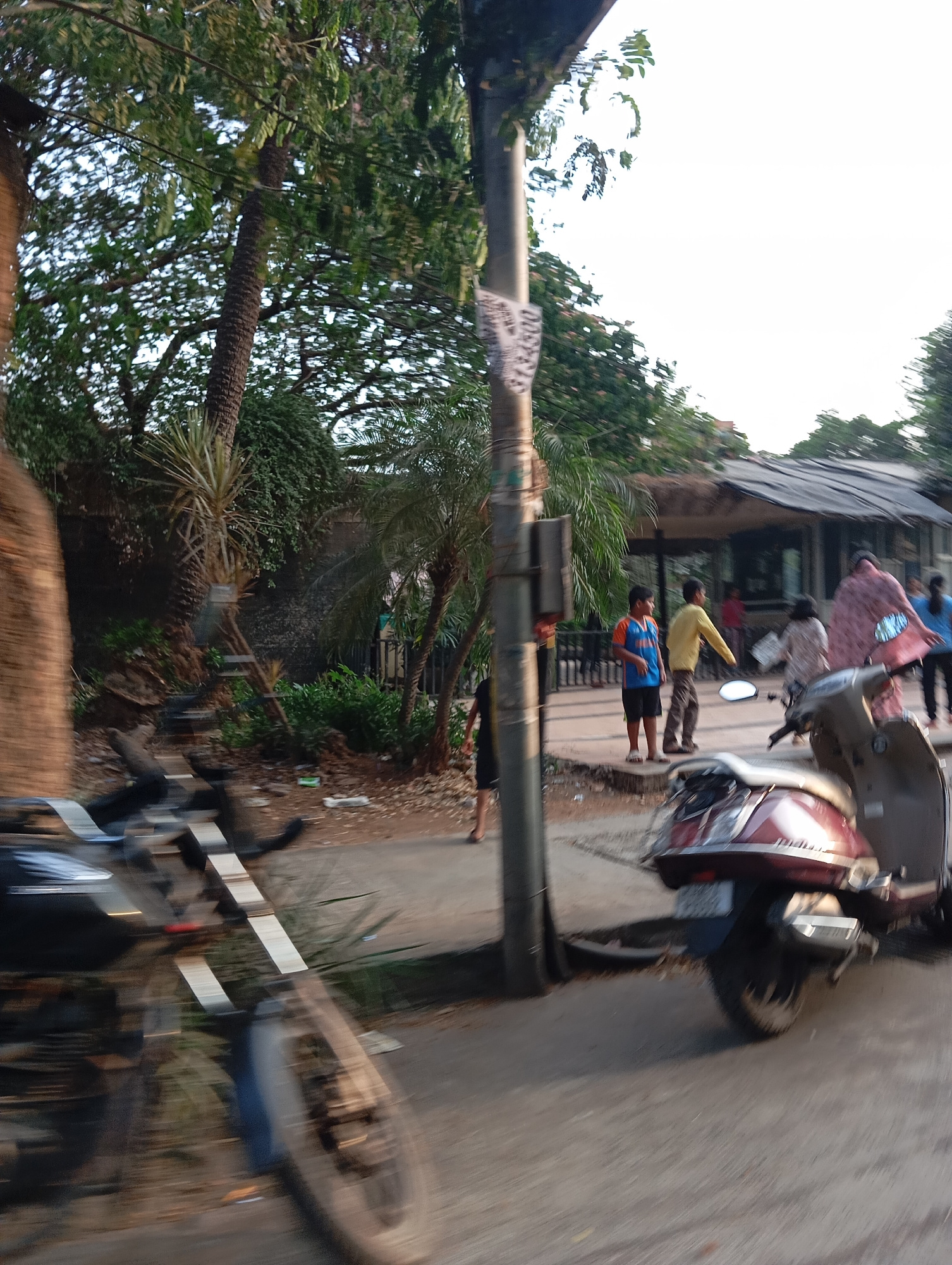 The image depicts an urban scene in Mumbai, India. The camera appears to be in motion, likely taken from a moving vehicle. A blurred motorcycle is in the foreground. In the midground, several people a…read more