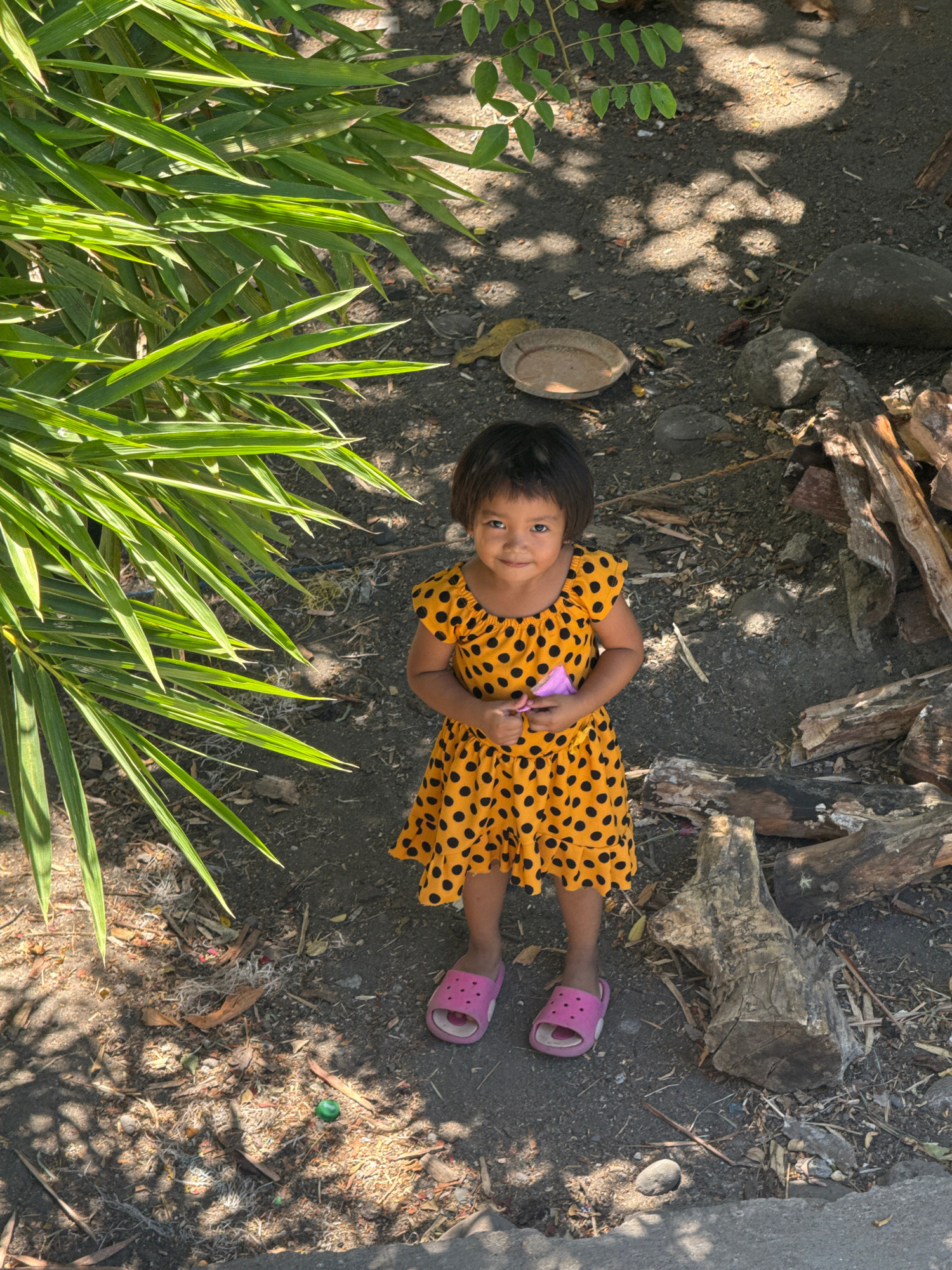 The scene depicts a young girl lying on the ground in what appears to be an outdoor area in Kiblawan, Philippines. She is wearing a yellow dress with black polka dots and pink sandals. The ground is a…read more