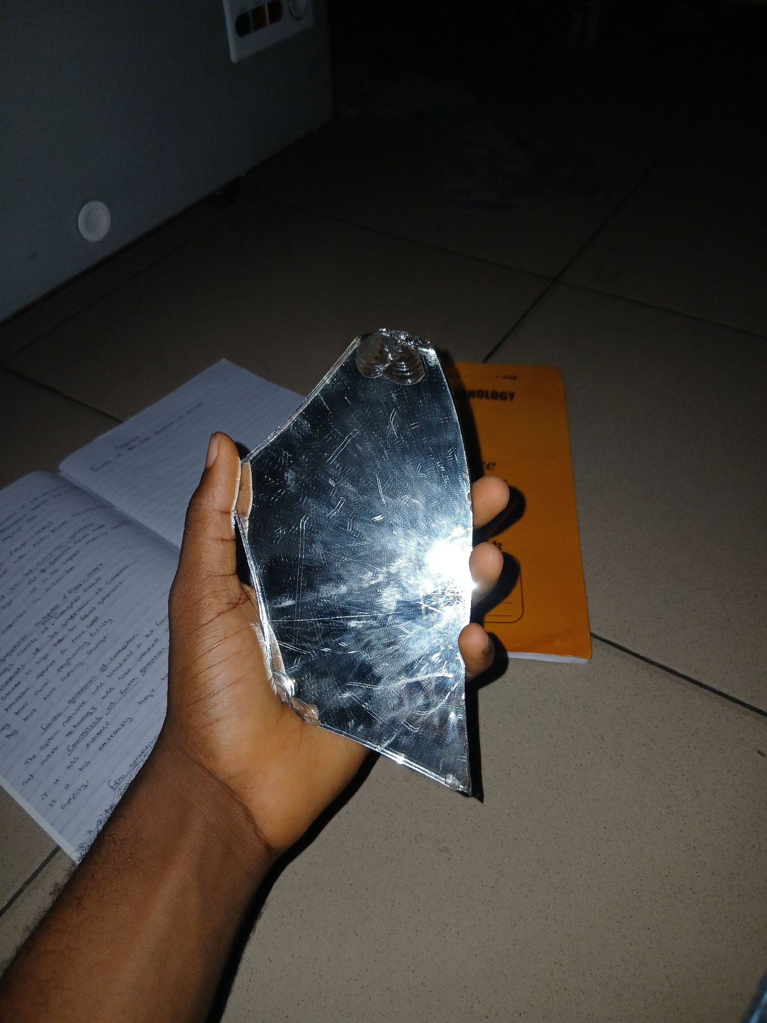 An indoor, close-up shot captures a person's hand holding a jagged piece of a broken mirror. The hand, with brown skin tone and some visible arm hair, firmly grasps the irregularly shaped, highly refl…read more