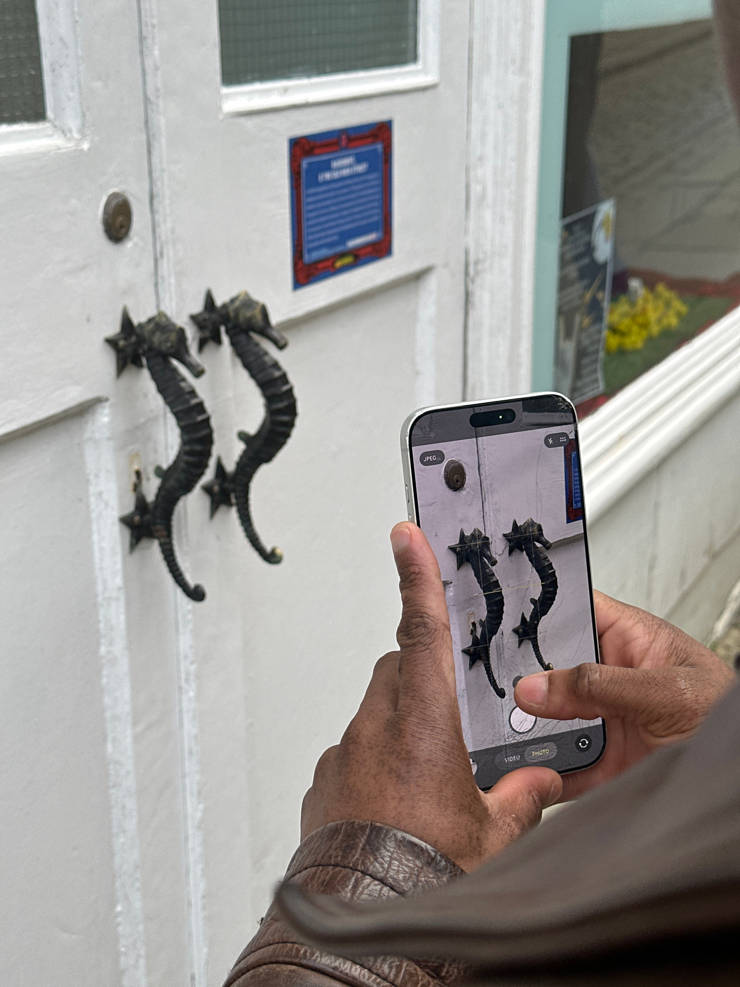 A person is holding an iPhone and taking a photo of two metal, seahorse-shaped door knockers on a white door. The door also has a glass panel with a blue plaque above it. The setting is likely a build…read more