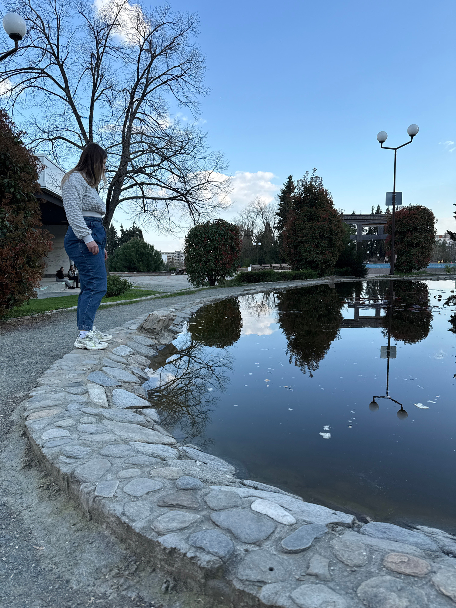 A young woman stands in an outdoor park setting in Stara Zagora, Bulgaria. The woman is positioned along a pathway lined with a stone retaining wall and looks at a water surface which reflects the lan…read more