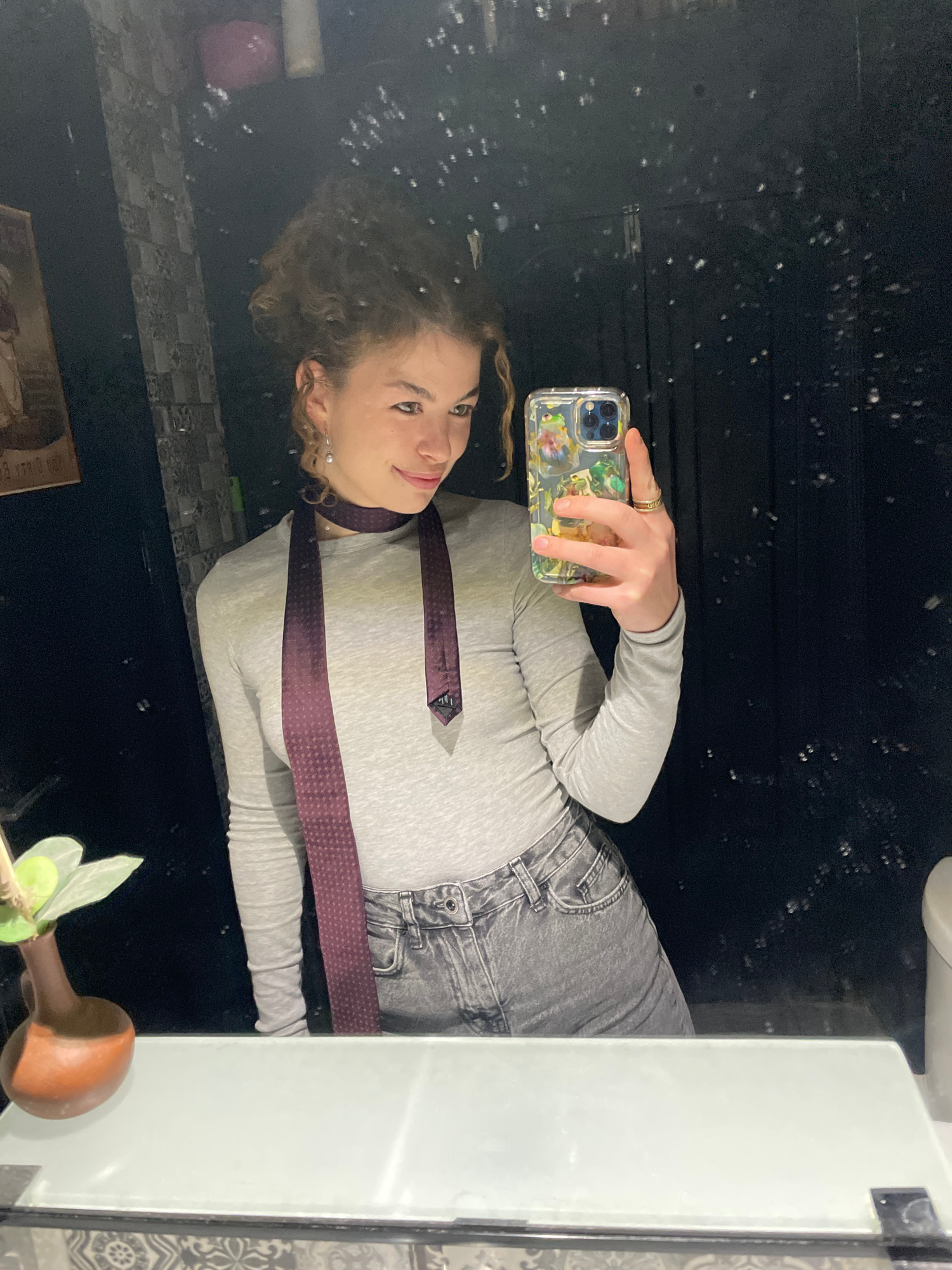 A woman is taking a selfie in a bathroom mirror. She has curly brown hair, fair skin, and is wearing a long-sleeved grey top, grey jeans, and a purple tie. She is holding a smartphone with a clear flo…read more