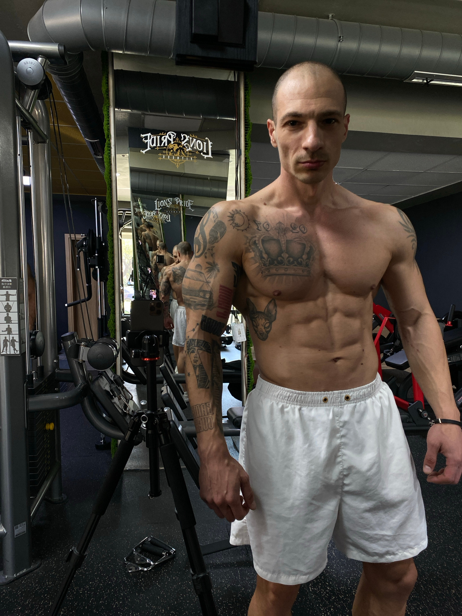 A shirtless, muscular man with a shaved head and numerous tattoos is standing in a gym. He is wearing white shorts. A mirror behind him shows a reflection of himself and the gym equipment. A camera is…read more