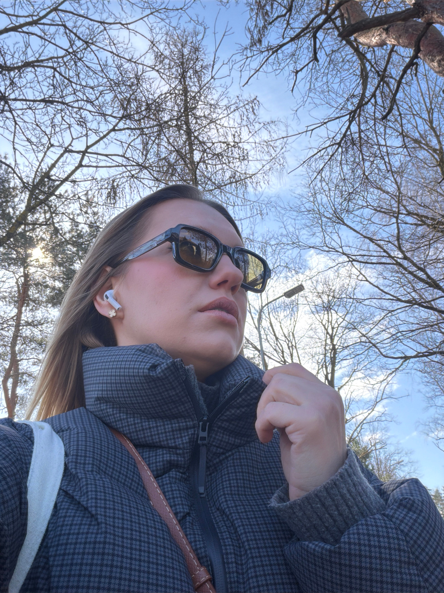A woman wearing a gray checkered puffer jacket and sunglasses is depicted in a low-angle shot. She is wearing an earbud in her left ear, and a brown bag strap is visible on her shoulder. Her hand is n…read more