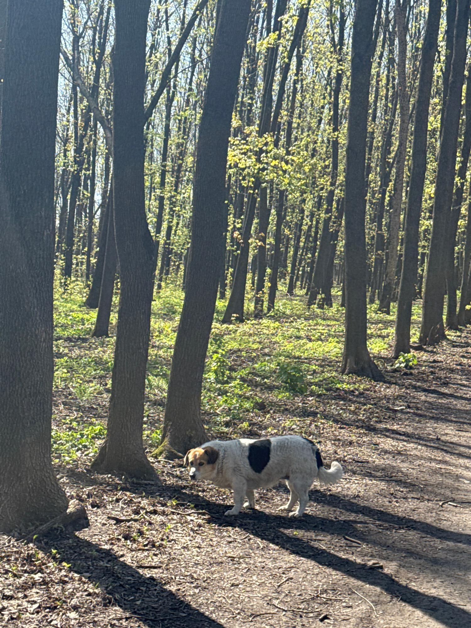 A white dog with a black patch on its back and a tan head stands on a sunlit dirt path in a forest or park. The path runs along the right side of the frame, marked by deep, elongated shadows cast by n…read more