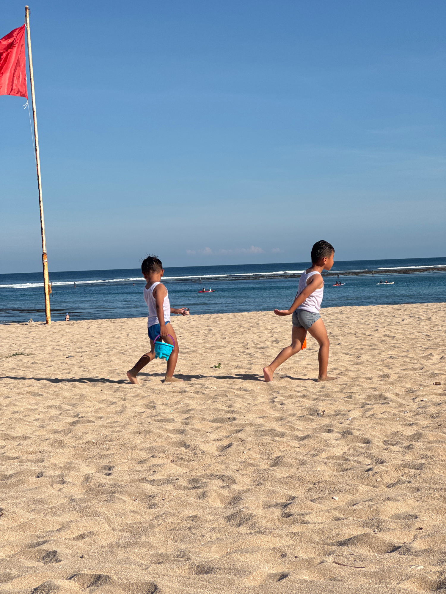 Two boys are on a sandy beach in Kuta Selatan, Indonesia. The boy in the foreground wears a white tank top and blue shorts and carries a blue bucket. The other boy, slightly further away, wears a whit…read more