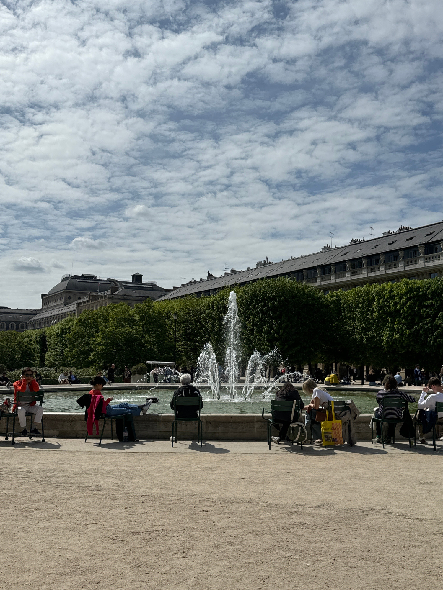 The image depicts an outdoor scene in what appears to be a public park or garden in Paris, France, viewed on a bright, partially cloudy day. The perspective shows a wide, light-colored gravel path on…read more