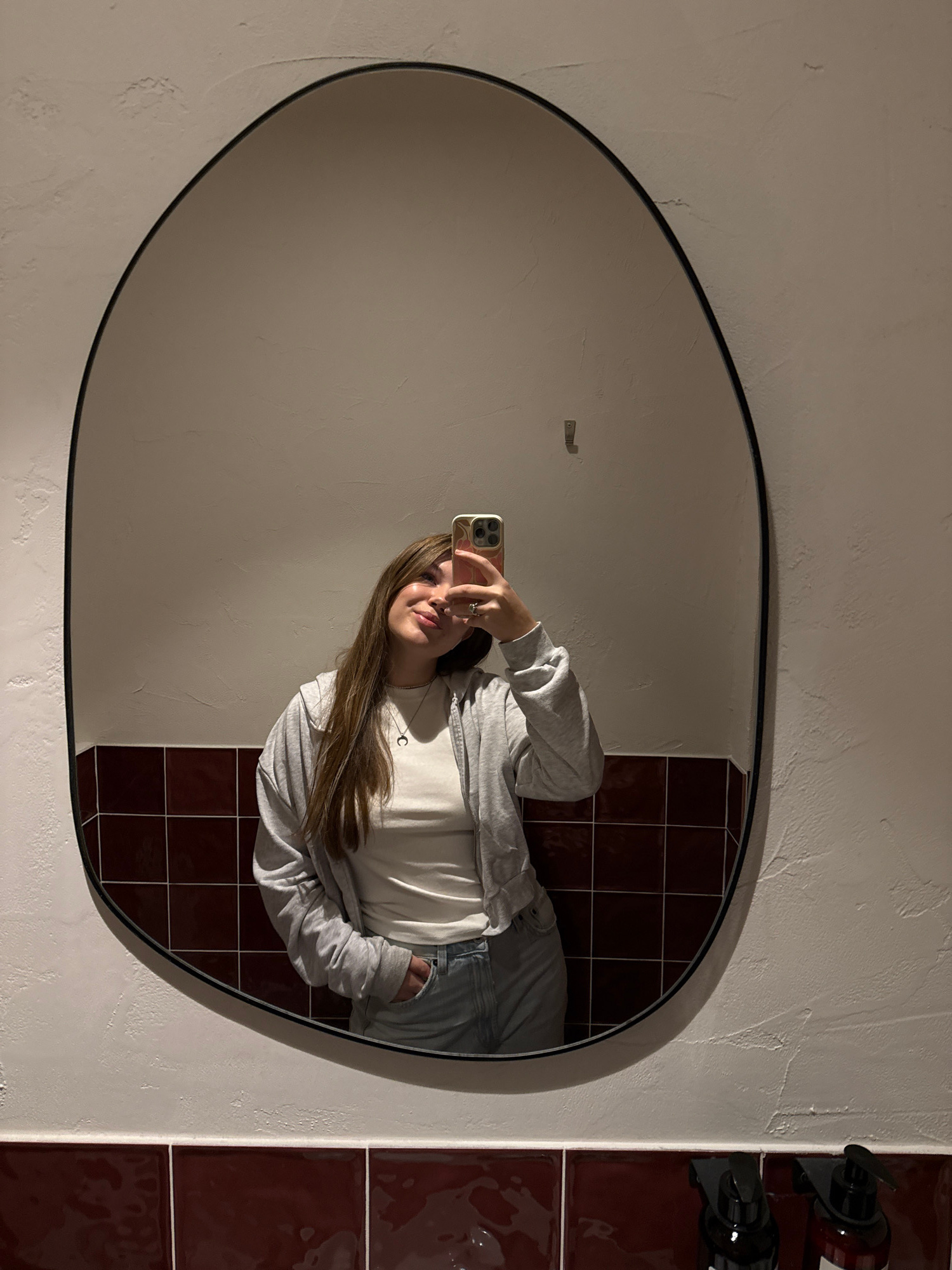 The photograph captures a mirror selfie taken in a bathroom with distinctive design elements, presumably in Belgrade, Serbia (though there's no definitive visual confirmation of the location). A youn…read more