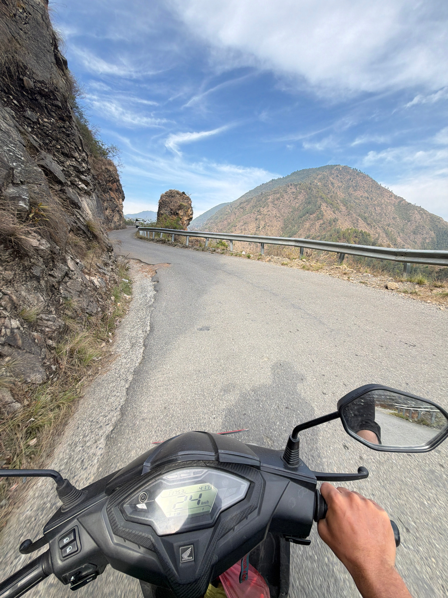View from a moving vehicle, likely a scooter, on a road in Indrasarowar, Nepal. The digital display shows a speed of 24 km/h. The road is bordered by a metal guardrail on one side and a steep, rocky c…read more