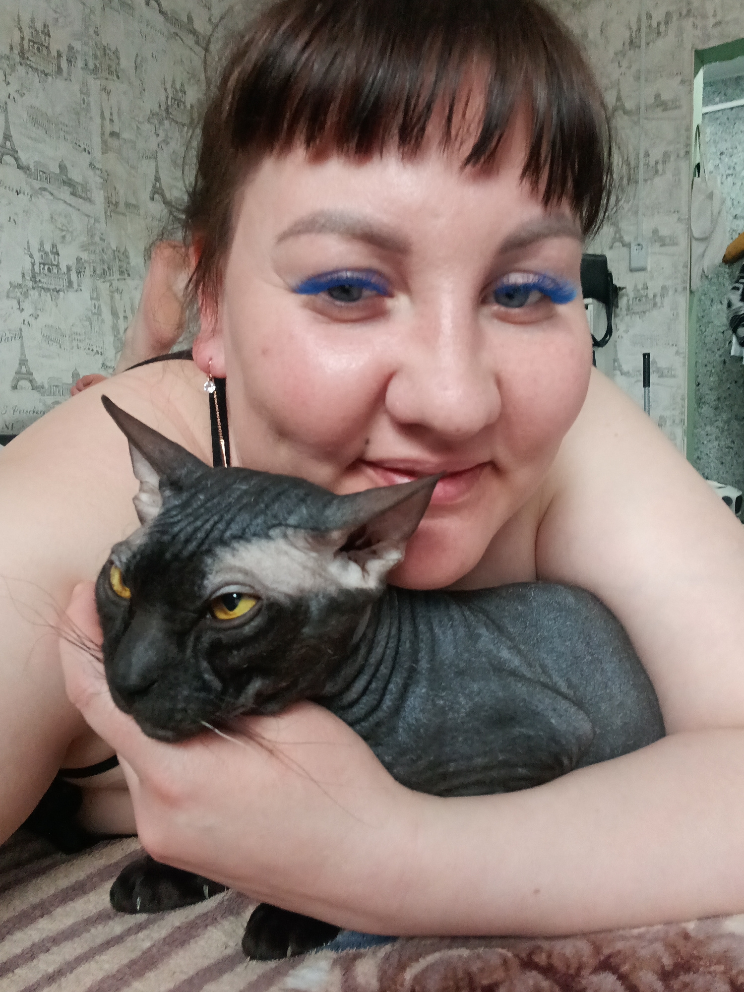 A woman with blue false eyelashes is prone on her stomach, embracing a dark gray Sphynx cat. She has dark brown hair with bangs and is smiling slightly. She has a black top on with a single long cryst…read more