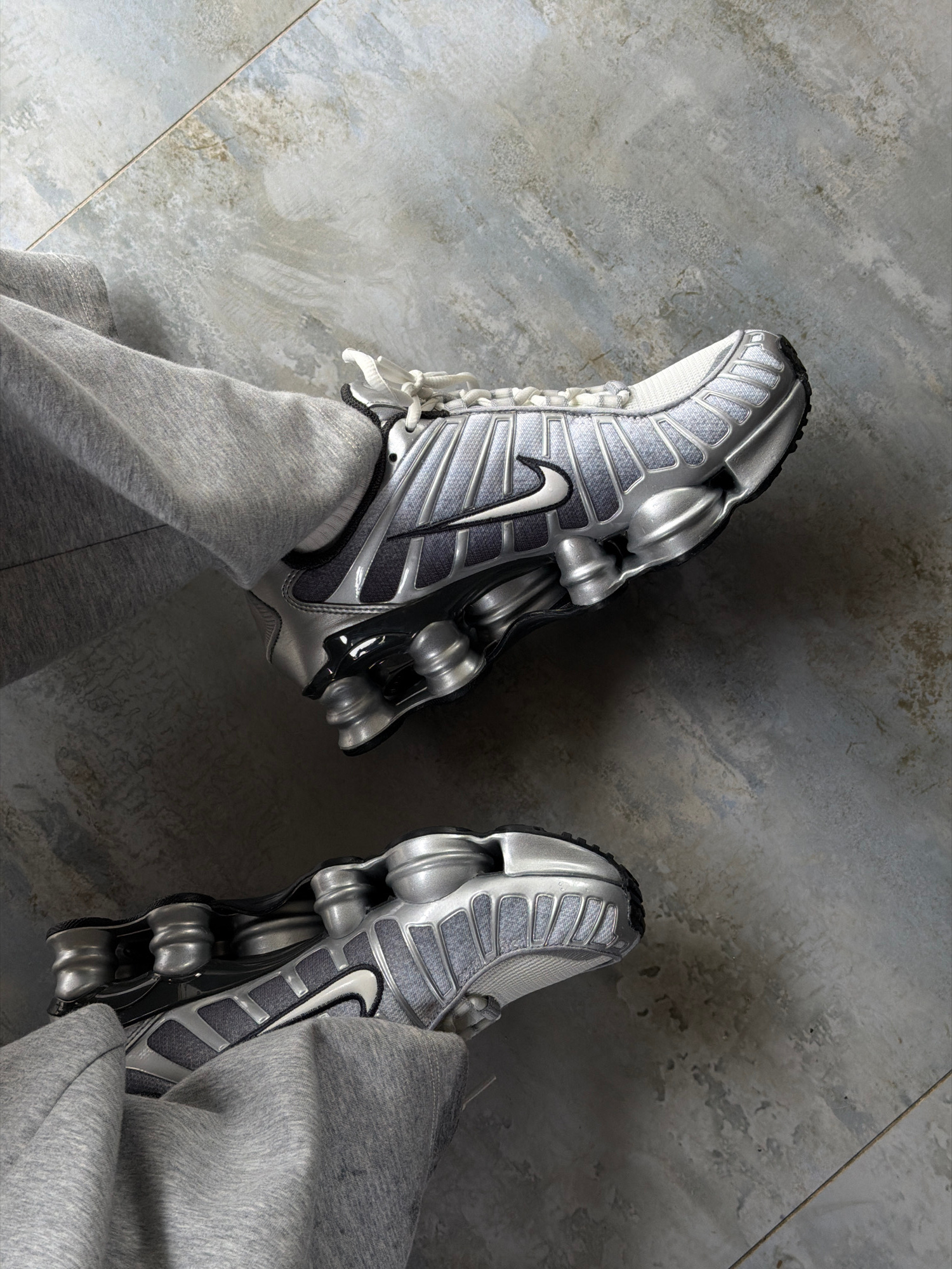 The image shows a person's-eye-view of a pair of silver Nike Shox TL sneakers on a gray concrete floor. The shoes are positioned in a standing stance, partially obscured by gray sweatpants. The settin…read more