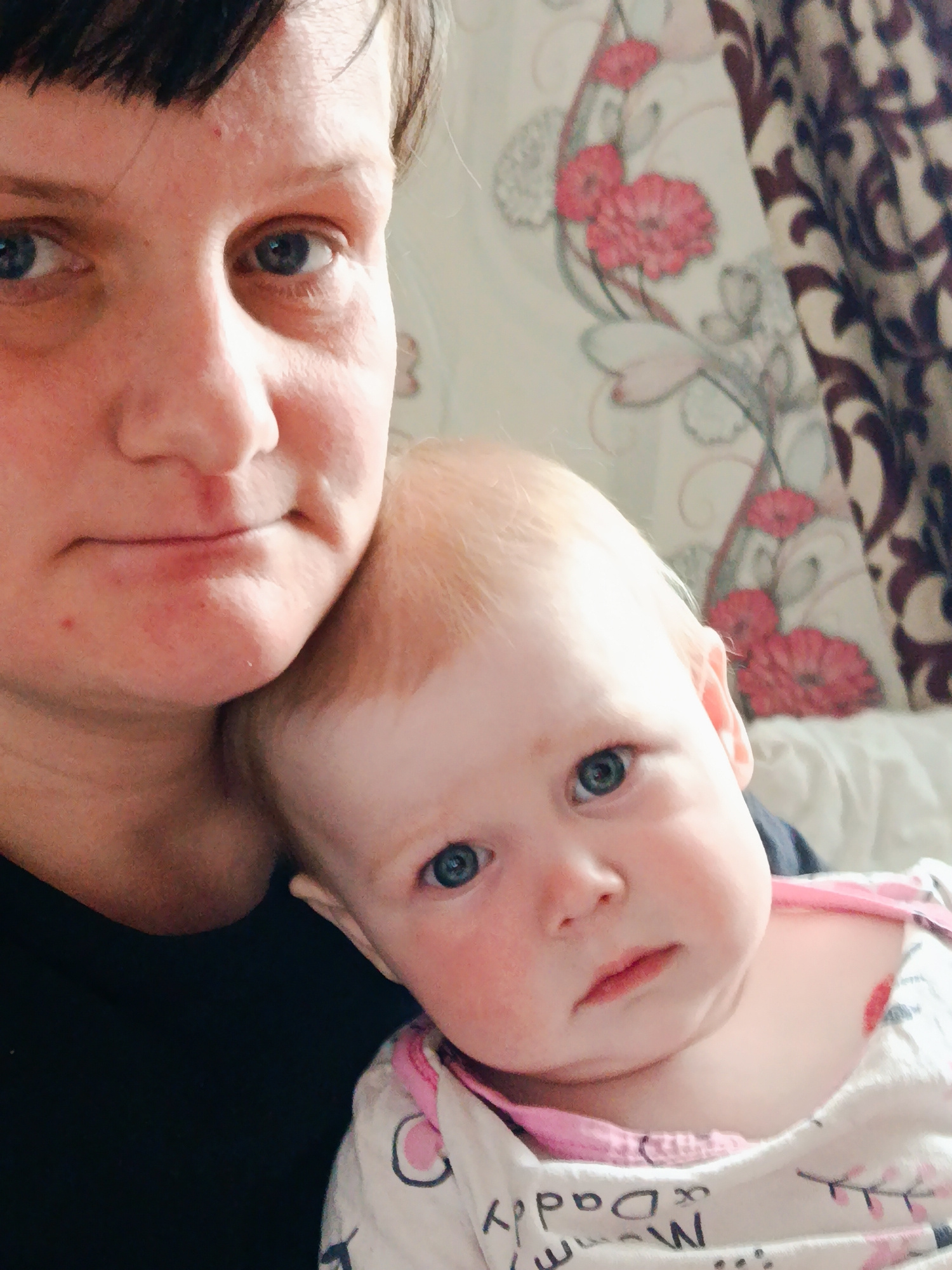 A close-up indoor portrait captures an adult woman holding a baby, both looking directly towards the camera. The woman, with short dark hair and blue eyes, occupies the left side of the frame, her fac…read more