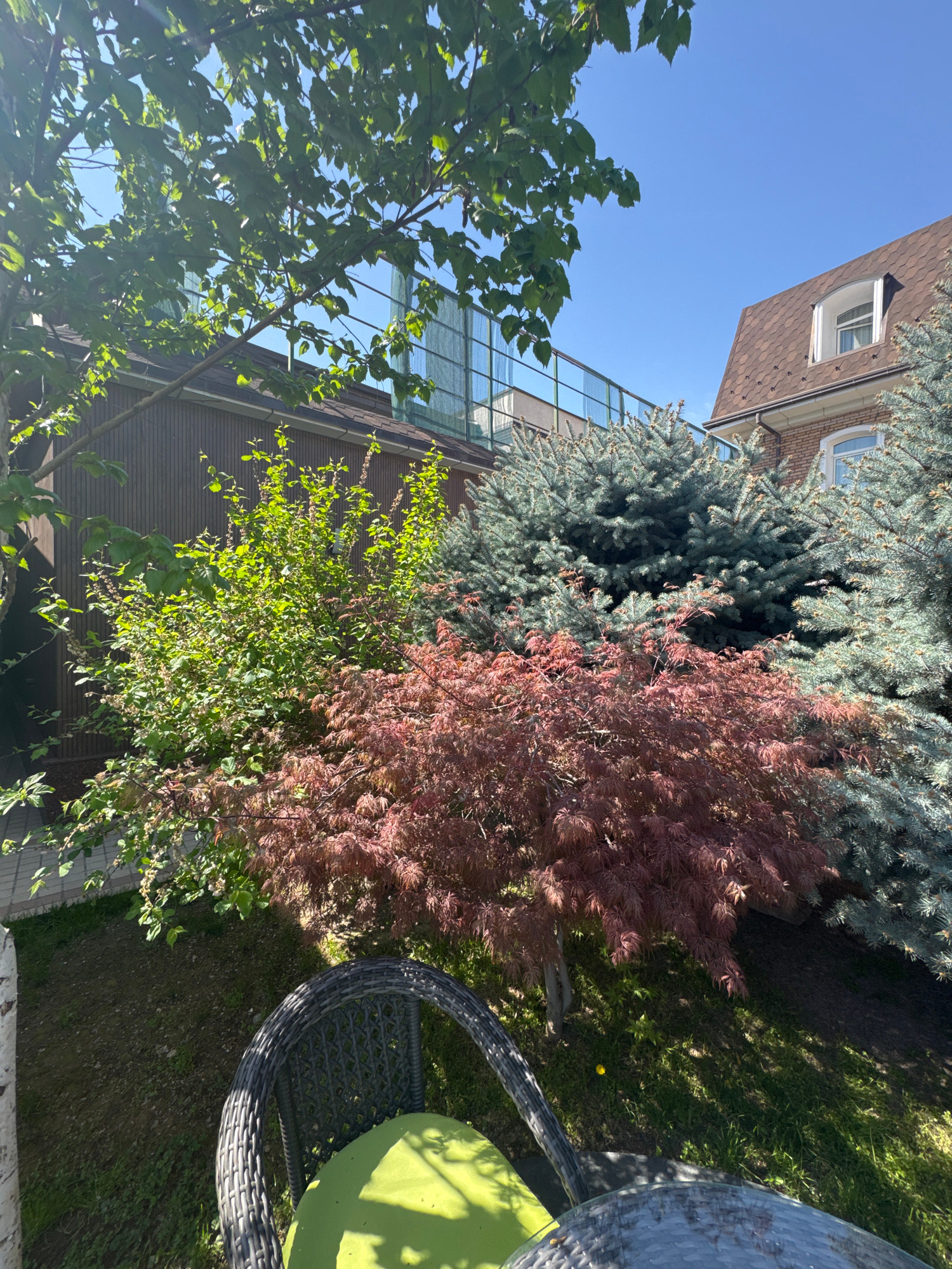 A garden setting with various plants and partial views of buildings. A blue spruce, a red Japanese maple, and a green deciduous tree are present. A modern building with a glass wall and a traditional…read more