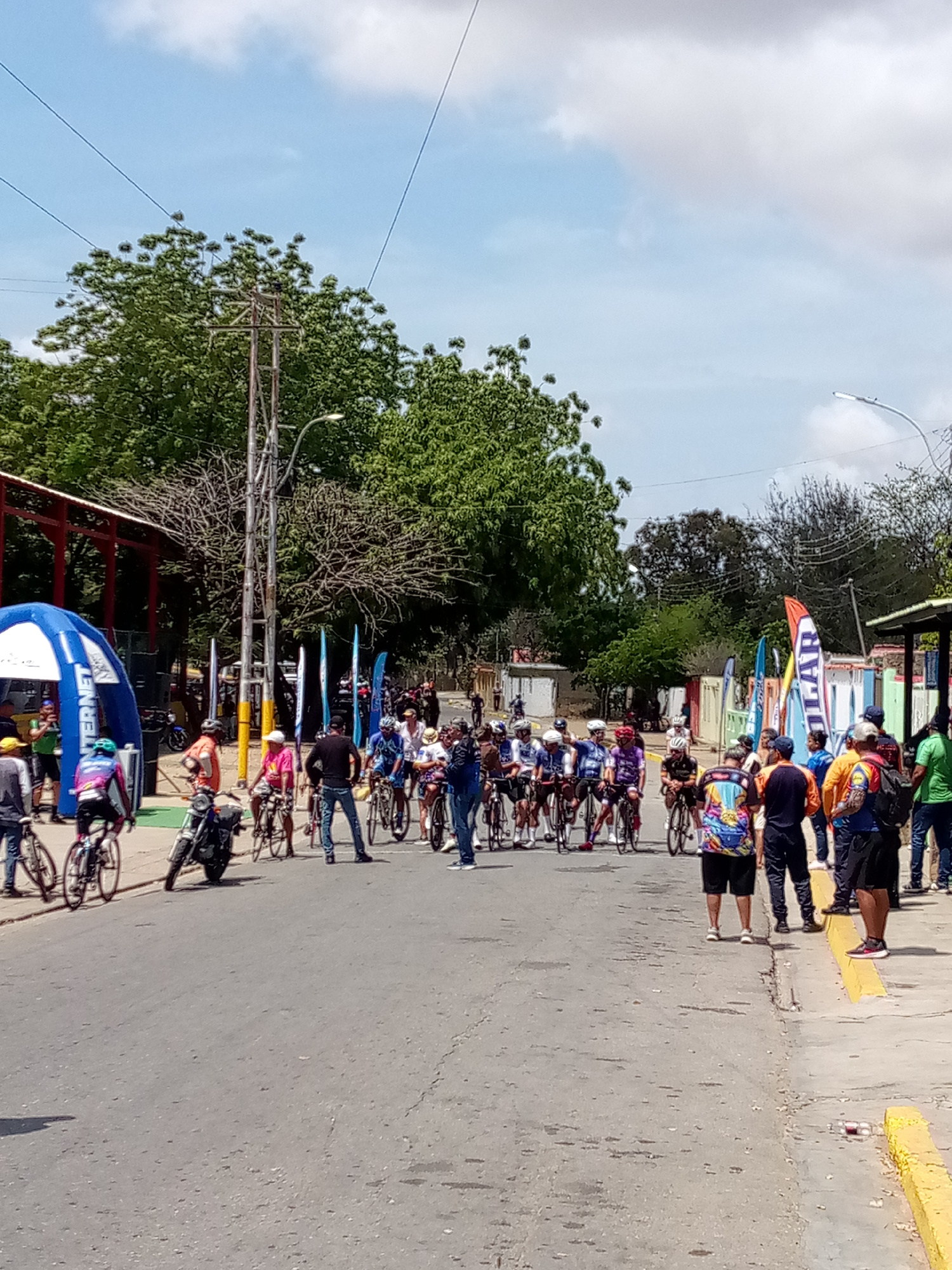 The image shows a cycling race in Guatacaral, Venezuela. A group of cyclists in racing attire is lined up on a street, ready for the start. Several people stand along the side of the road, observing t…read more