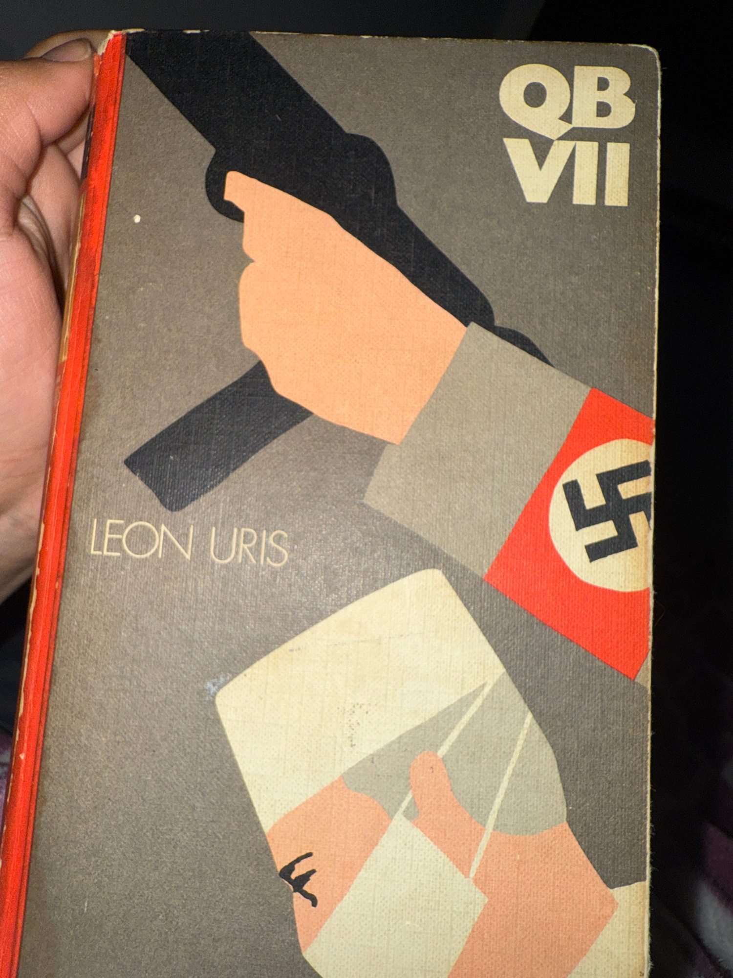The image shows the cover of the book "QB VII" by Leon Uris. The cover art features a stylized depiction of a person holding a pistol, with a swastika on their arm. The book's title, "QB VII," is prin…read more