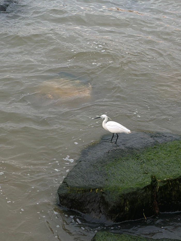 An overhead photograph captures a white wading bird, likely an egret, standing in shallow, rippling water next to a dark, moss-covered structure. The bird is positioned in the upper right portion of t…read more