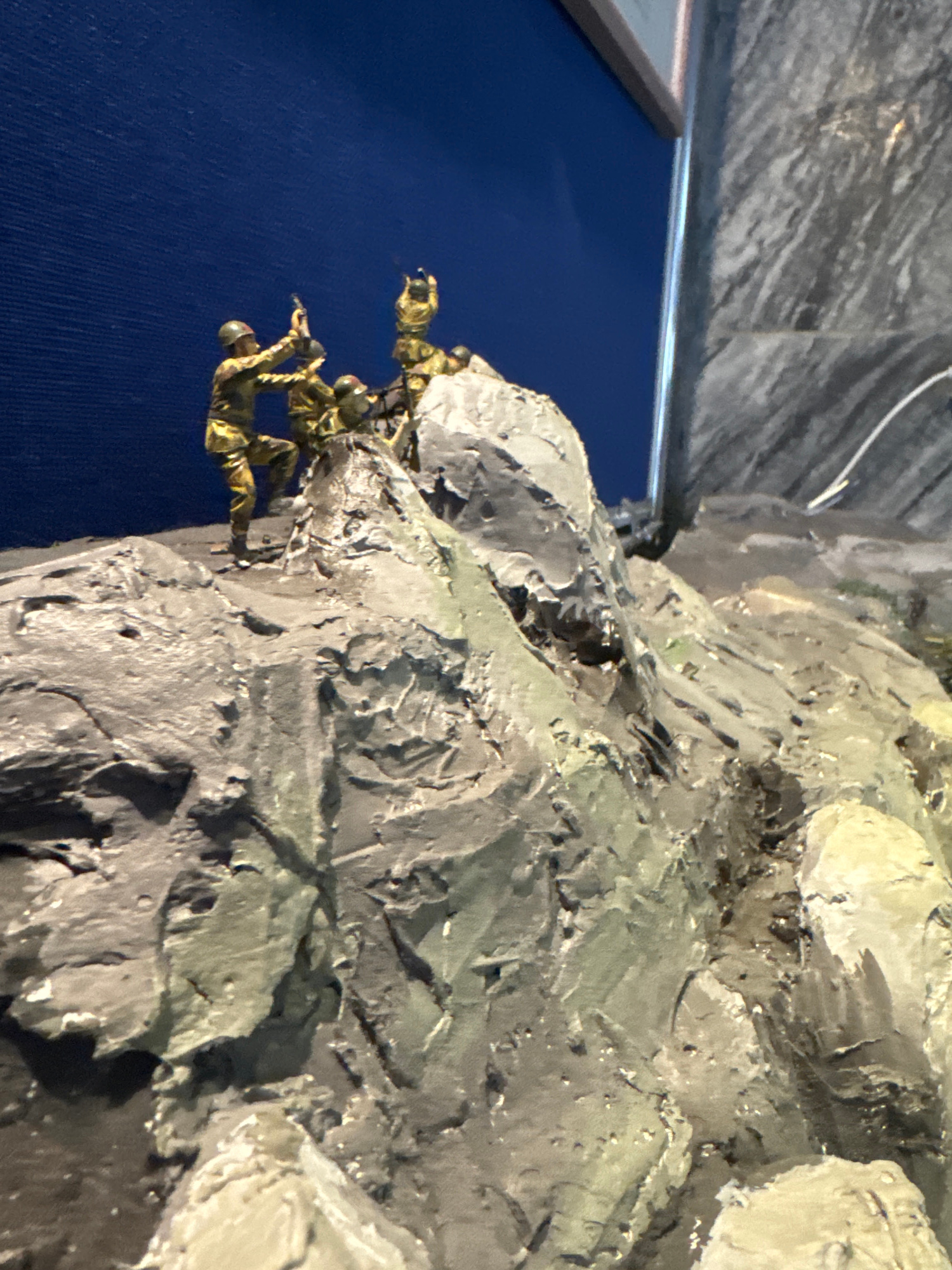 A close-up photograph depicts a diorama of soldiers climbing a rocky terrain. The figures are small, and their uniforms are shaded in green and brown tones. The rocky landscape is made of textured gra…read more