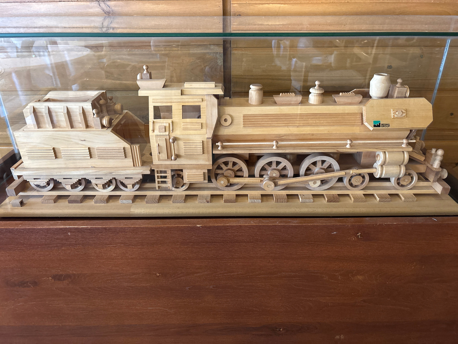 The image shows a wooden model train displayed in a glass case. The model is intricately crafted with visible details like wheels, carriages, and a locomotive. The train is sitting on wooden tracks. T…read more