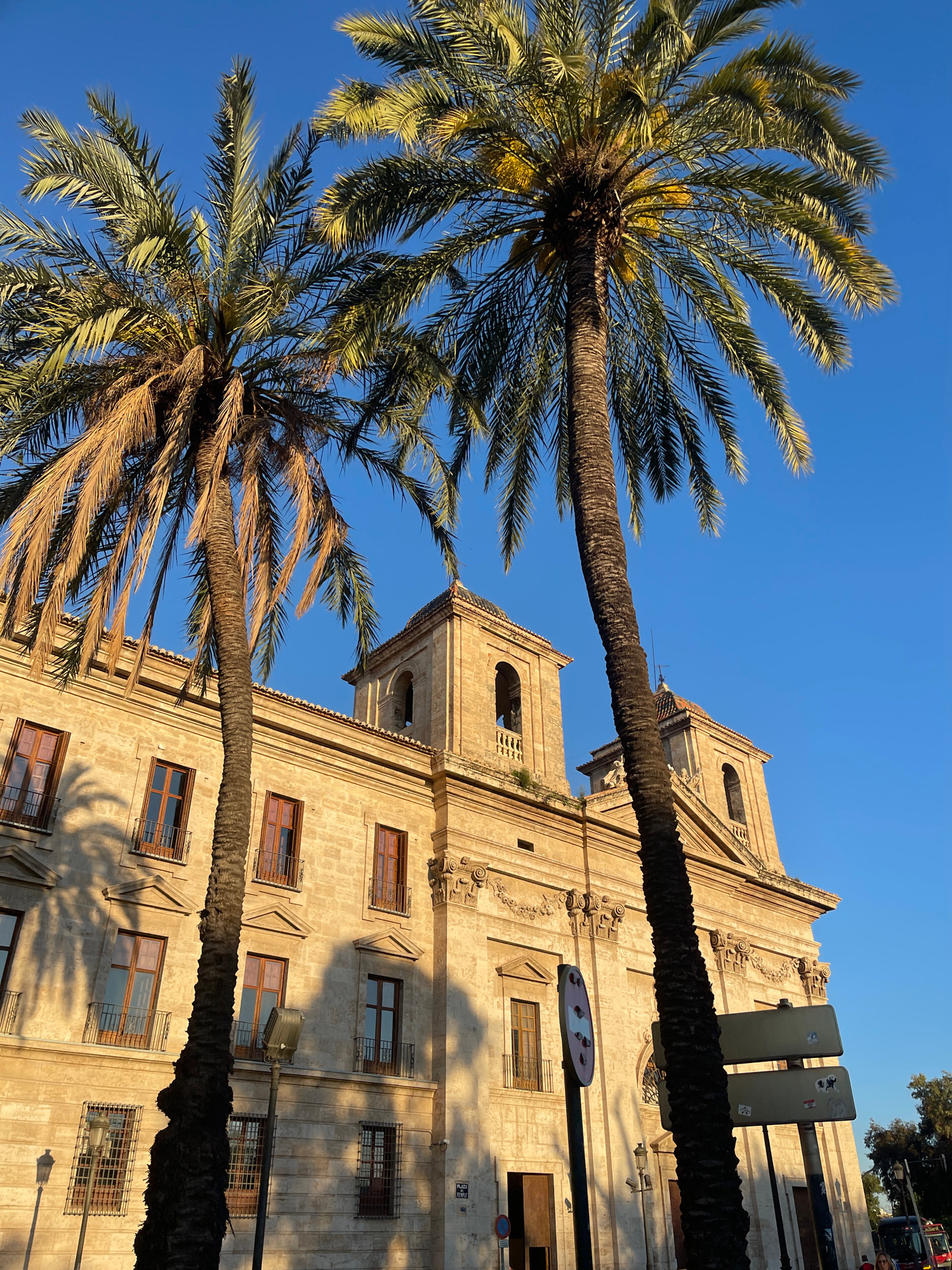 The image shows a view of a building and two palm trees against a bright blue sky. The building is made of light-colored stone and features rows of windows, ornate carvings, and a bell tower. The palm…read more