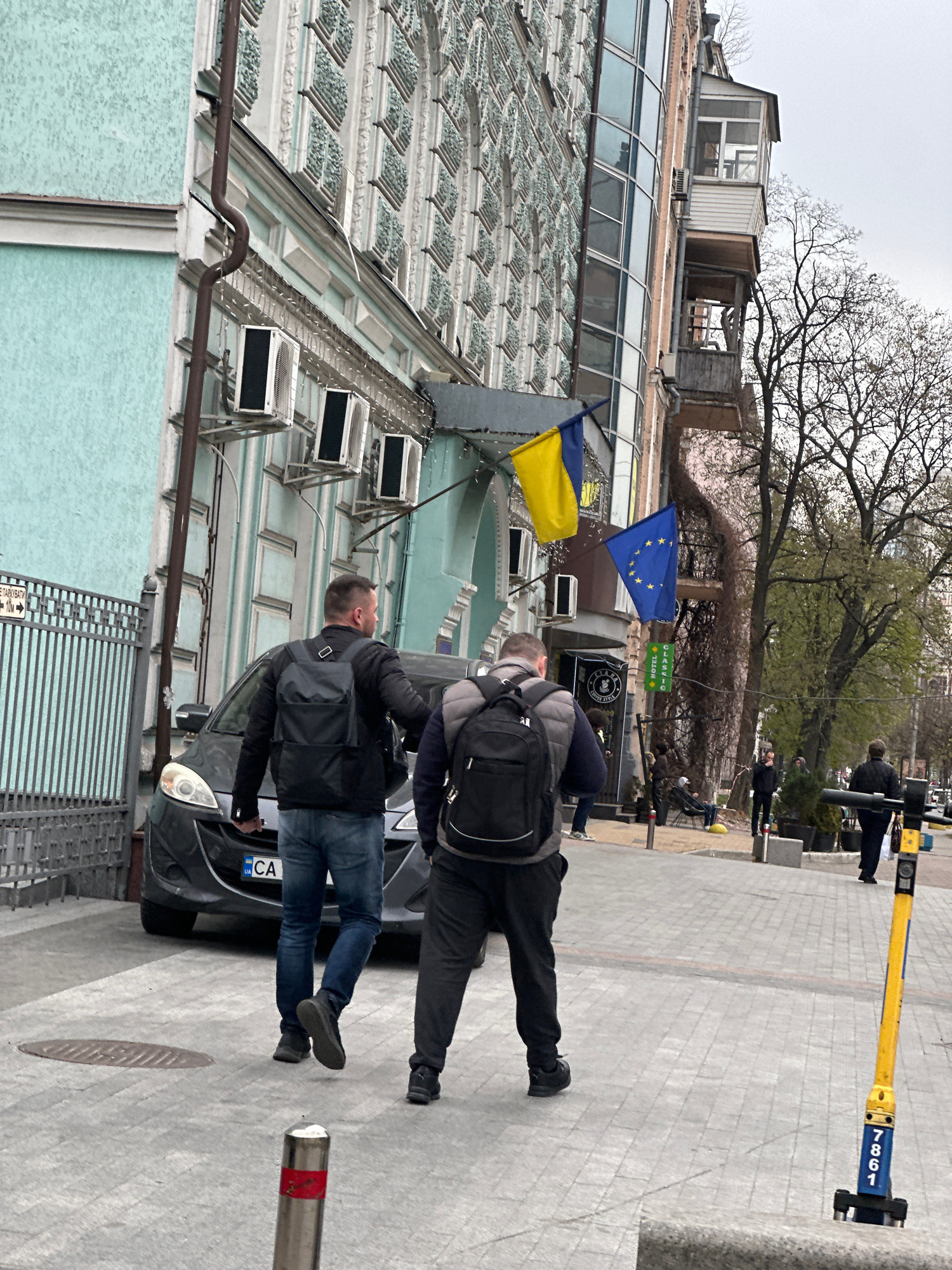 An urban street scene unfolds on an overcast day, likely springtime given the bare and budding trees. The perspective is from a slightly elevated position looking down a sidewalk lined with buildings.…read more