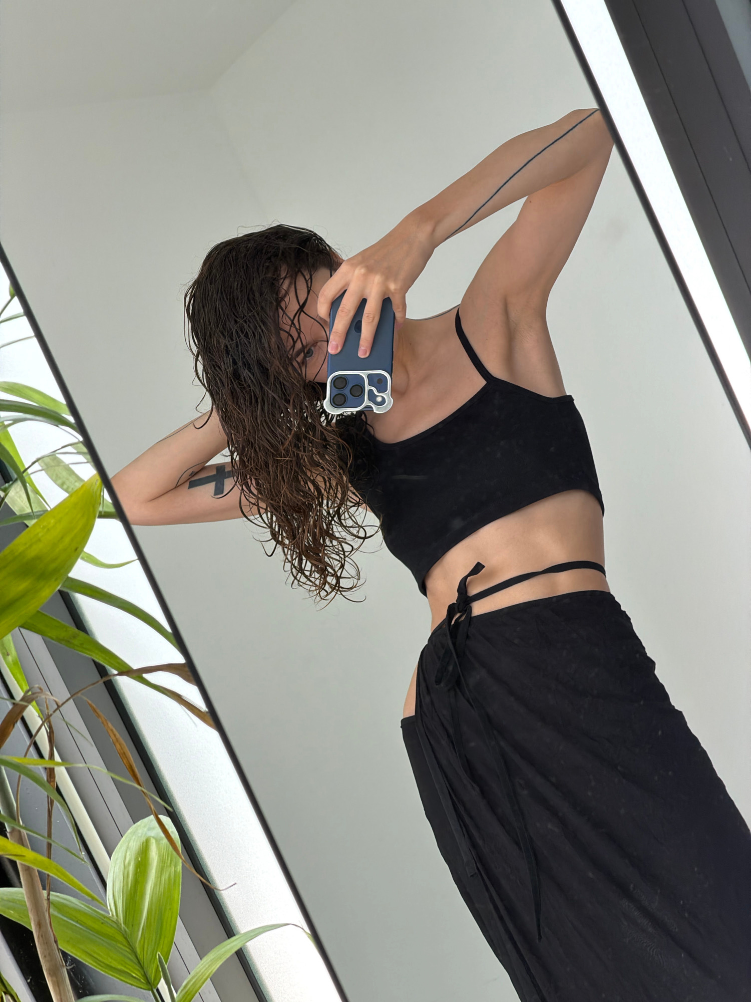 A mirrored self-portrait shows a woman holding a blue smartphone with a cartoon-like sticker on the back casing. She wears a black crop top and a loose, black skirt tied at the waist. Her brown, wet h…read more