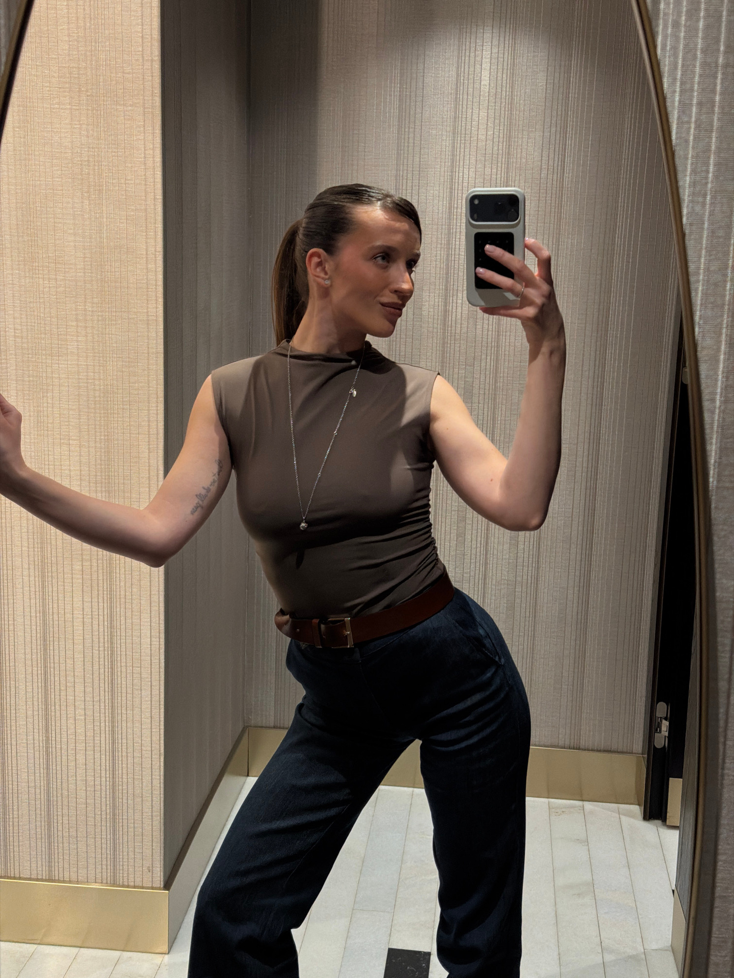 A medium shot depicts a person reflected in a mirror, taking a selfie. The individual has dark hair pulled back into a low ponytail, a brown T-shirt, dark jeans, and a brown belt. They wear a delicate…read more
