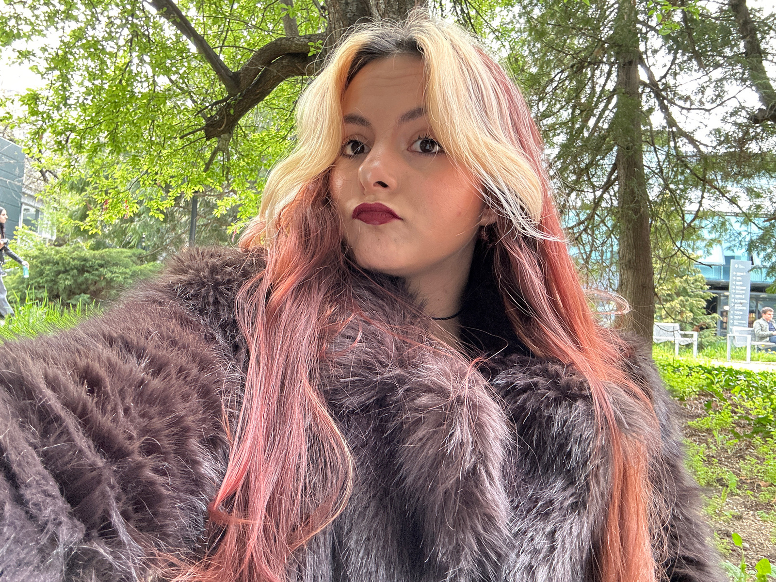 The image presents an upside-down close-up portrait of a person, likely female, framed by their multi-toned hair and a fluffy, dark garment. The individual's hair features prominent dark sections, vib…read more