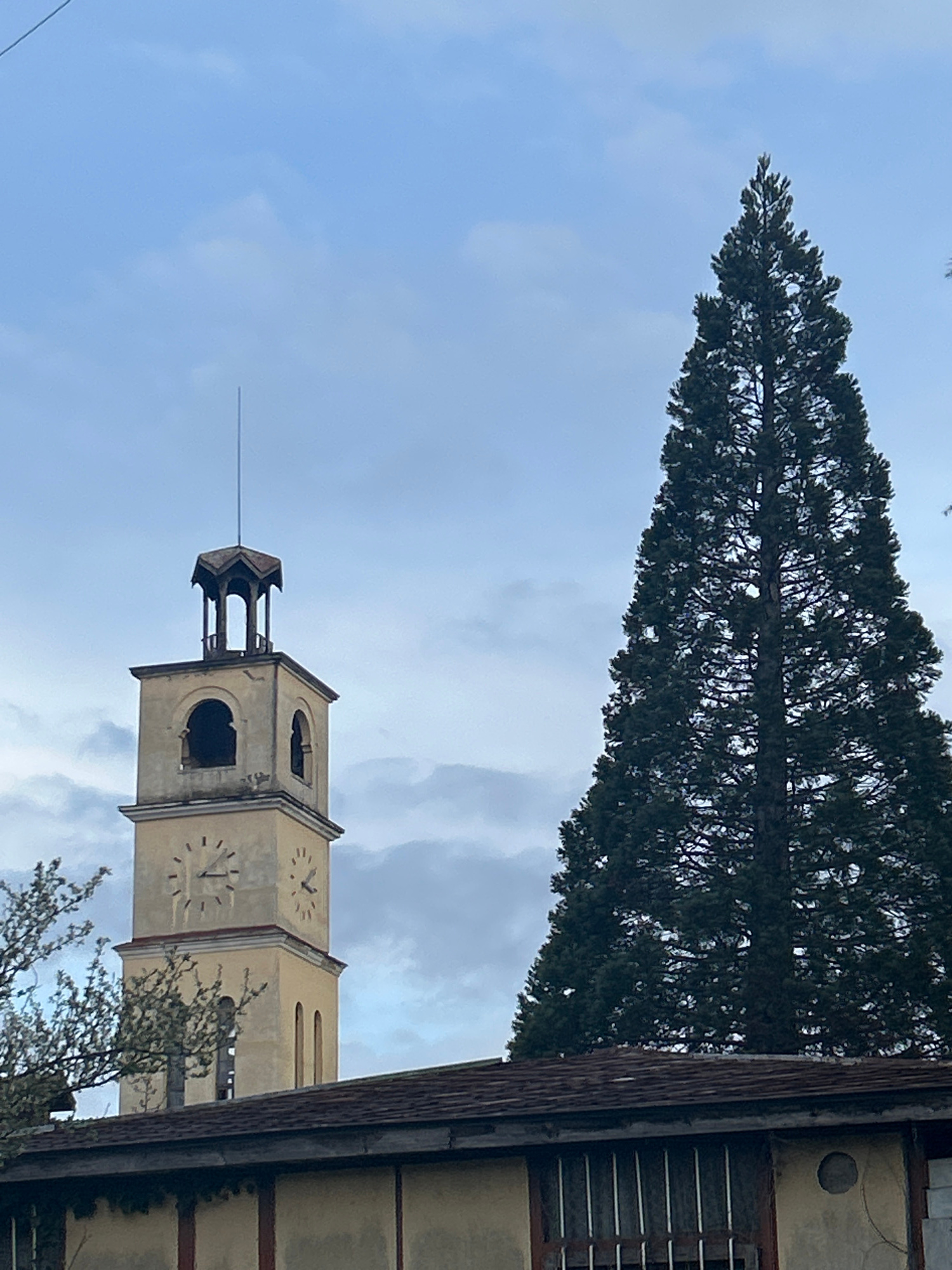 The image captures a clock tower in Zlatograd, Bulgaria. The tower is beige with arched openings and clocks on multiple sides. A tall, coniferous tree stands adjacent to the tower, reaching upwards in…read more