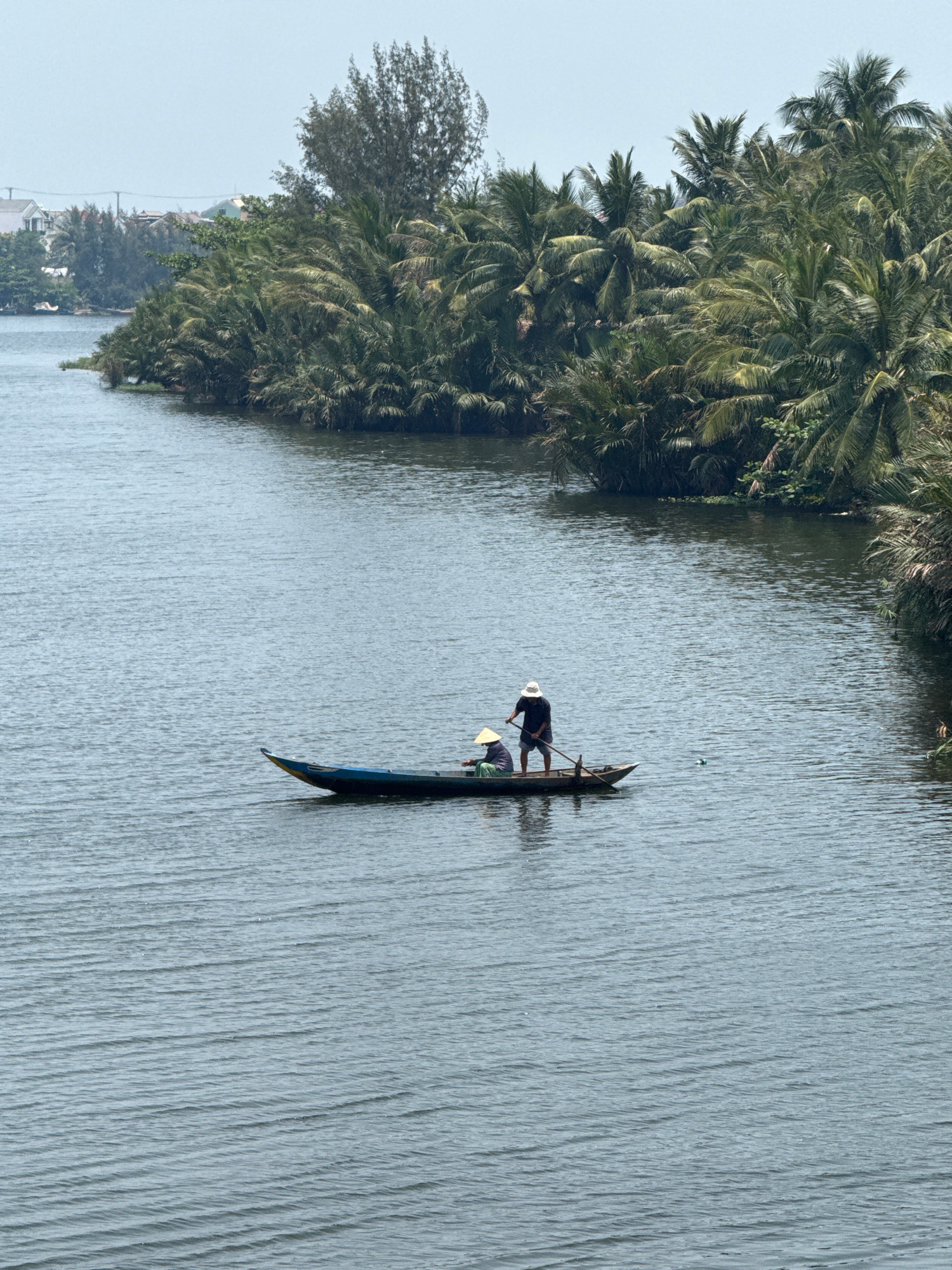 Two people are in a narrow boat on a river. One person is standing and holding a long pole, possibly pushing the boat. The other person is sitting in the boat. The river is lined with trees and vegeta…read more