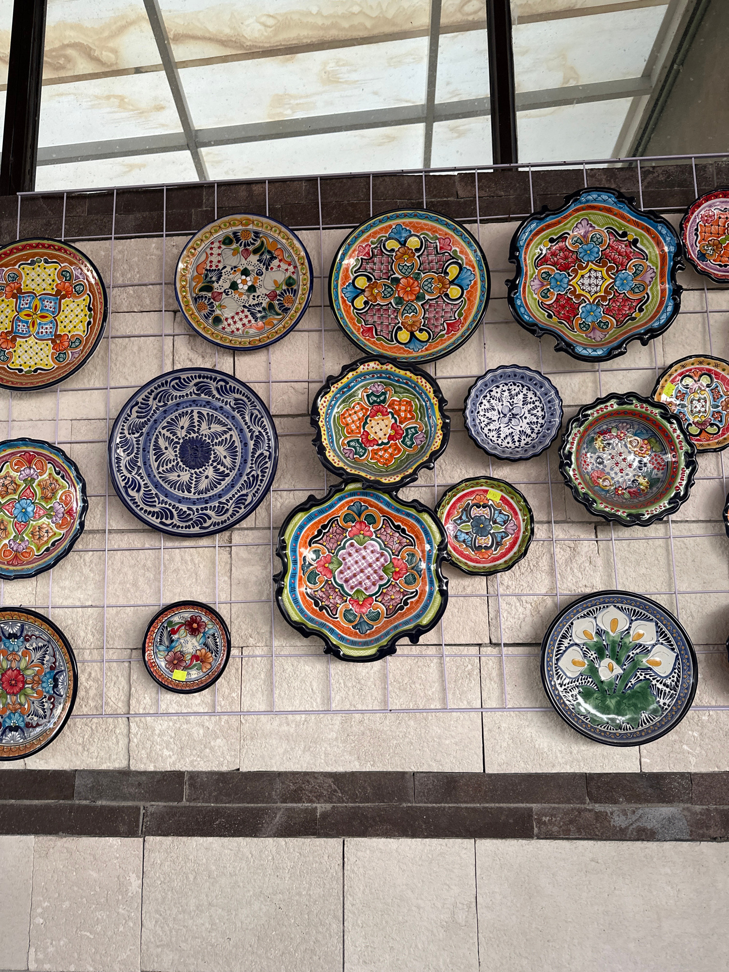 The image shows a wall decorated with a grid of wire upon which are hung several decorative ceramic plates. The plates are varied in size and design, featuring bright colors and intricate patterns. Th…read more