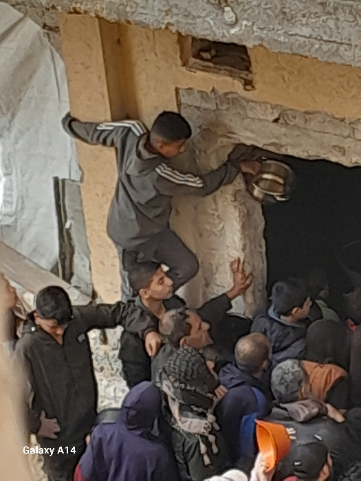 In Khan Yunis, Palestinian Territory, a crowd of individuals is gathered within what appears to be a partially damaged or makeshift interior space. A young male, wearing a grey tracksuit with white st…read more