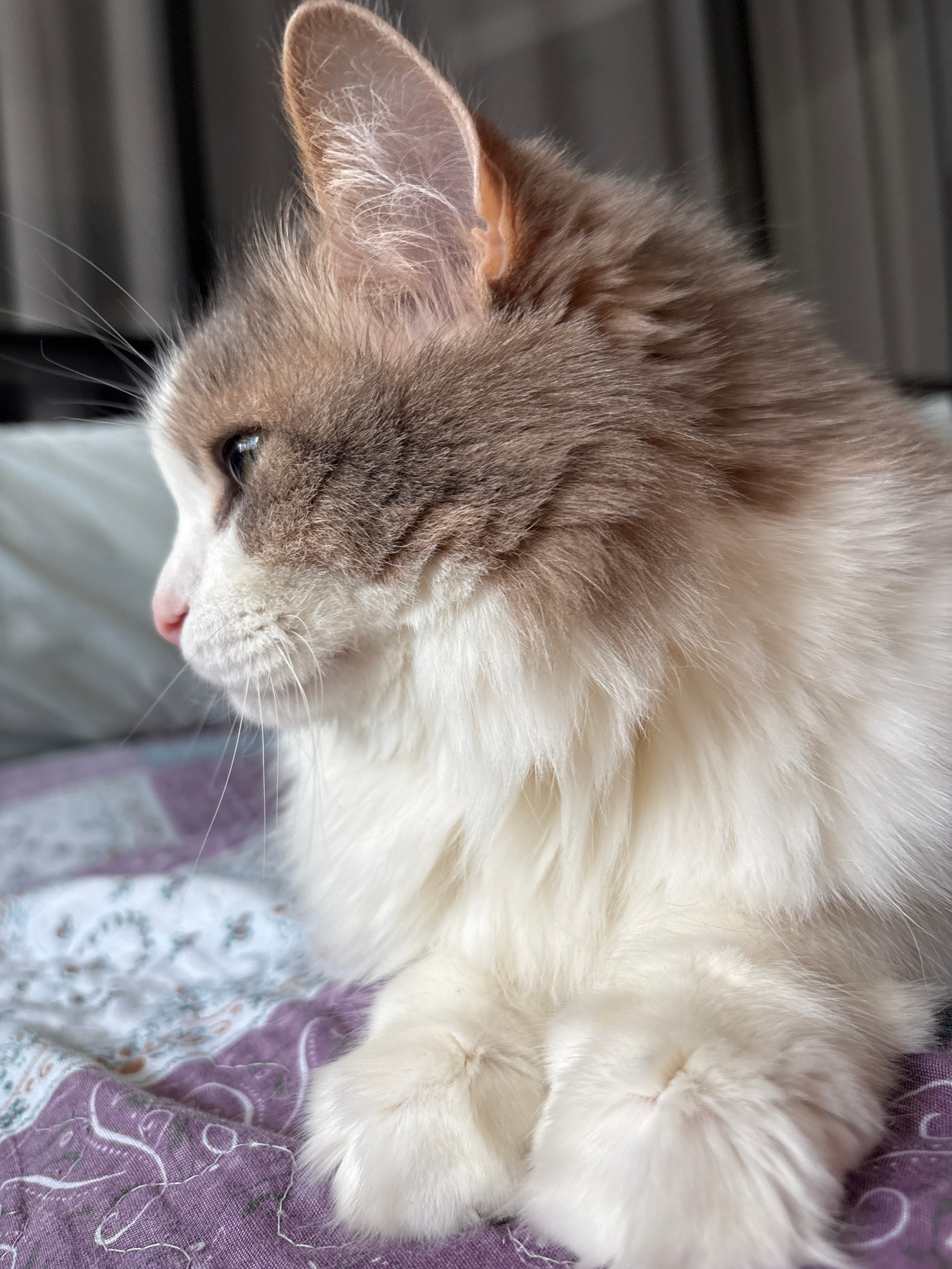 A long-haired cat, predominantly white with gray and brown markings on its head and ears, is lying on a patterned purple and white fabric. The cat's head is positioned towards the lower left, with itsβ¦read more