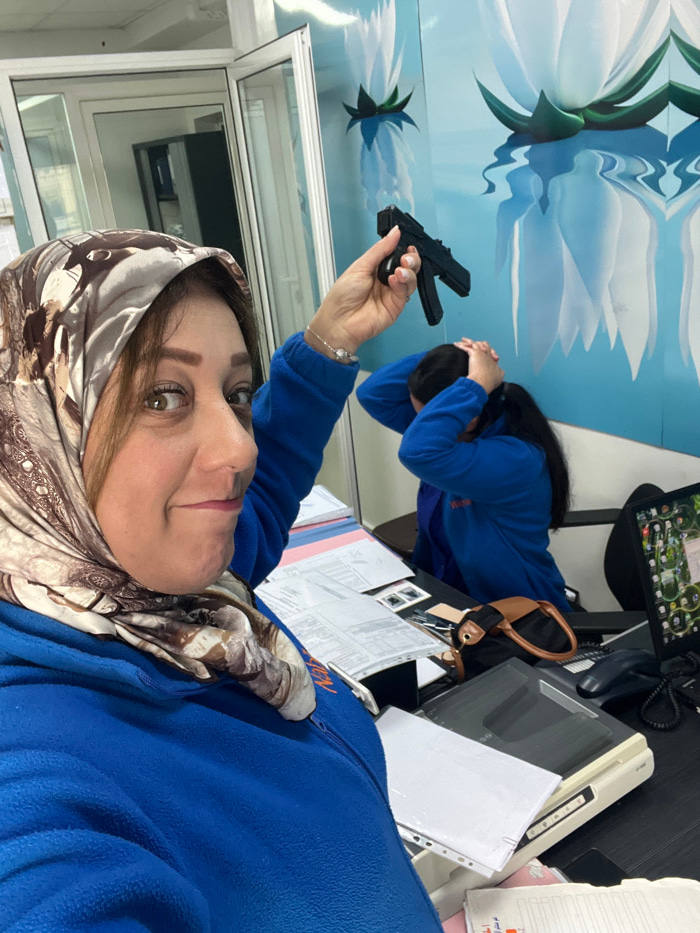 An indoor office scene in Meknes, Morocco, captured from a close-up perspective. In the foreground, a female subject, wearing a beige patterned hijab and a blue zippered fleece top, smiles directly at…read more