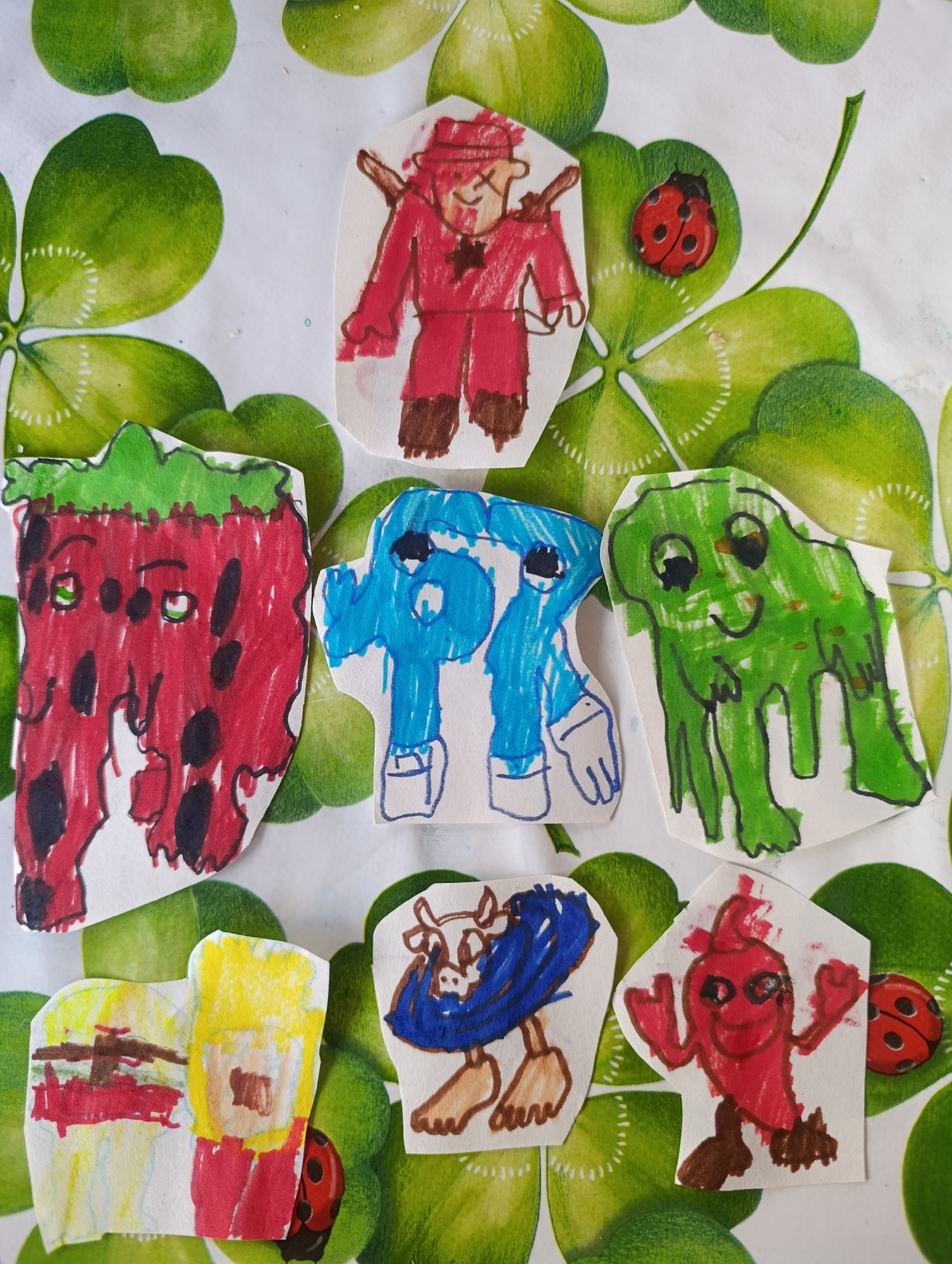 The image shows seven paper cut-outs arranged on a surface decorated with a green clover pattern. The cut-outs appear to be childlike drawings of various characters and objects, colored with markers.…read more