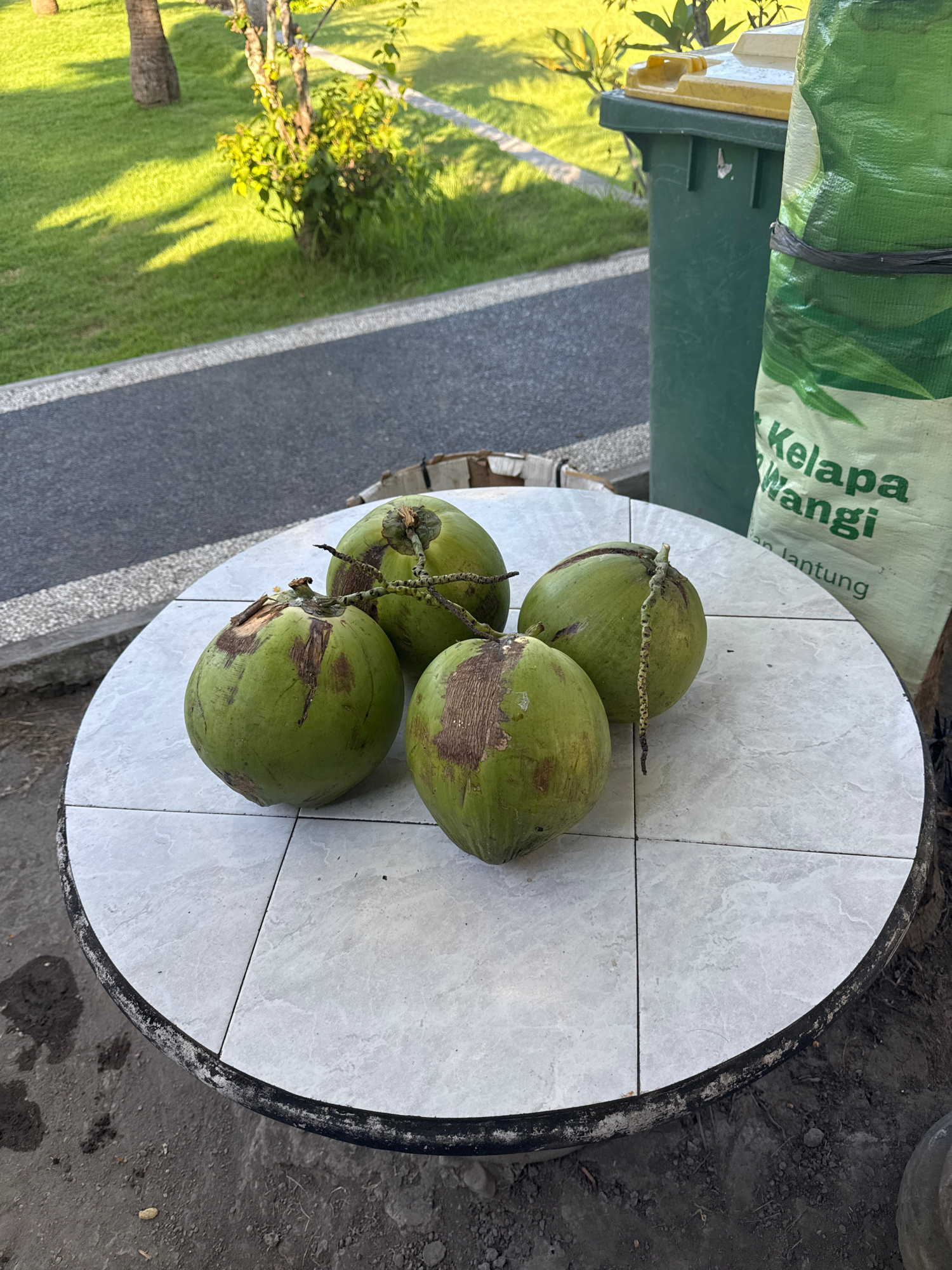 Four green coconuts are prominently displayed on a round table with a light gray tiled surface. The coconuts appear fresh, with some natural brown marks on their green husks. A partial stem segment co…read more