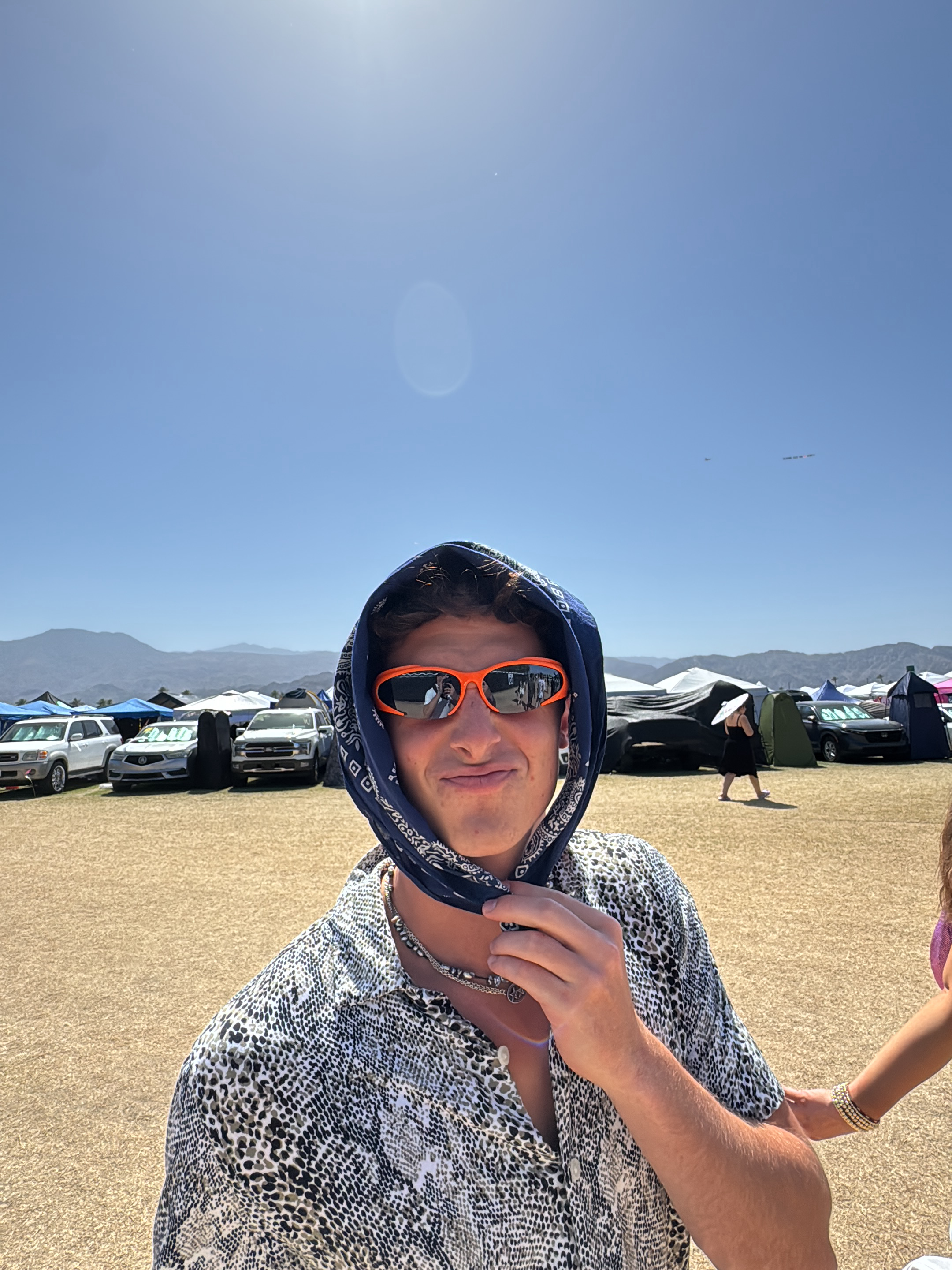 A fair-skinned male wearing an open black-and-white snakeskin-patterned button-down shirt and a silver necklace is shown in a medium shot against an outdoor background. He has a dark blue bandana wrap…read more
