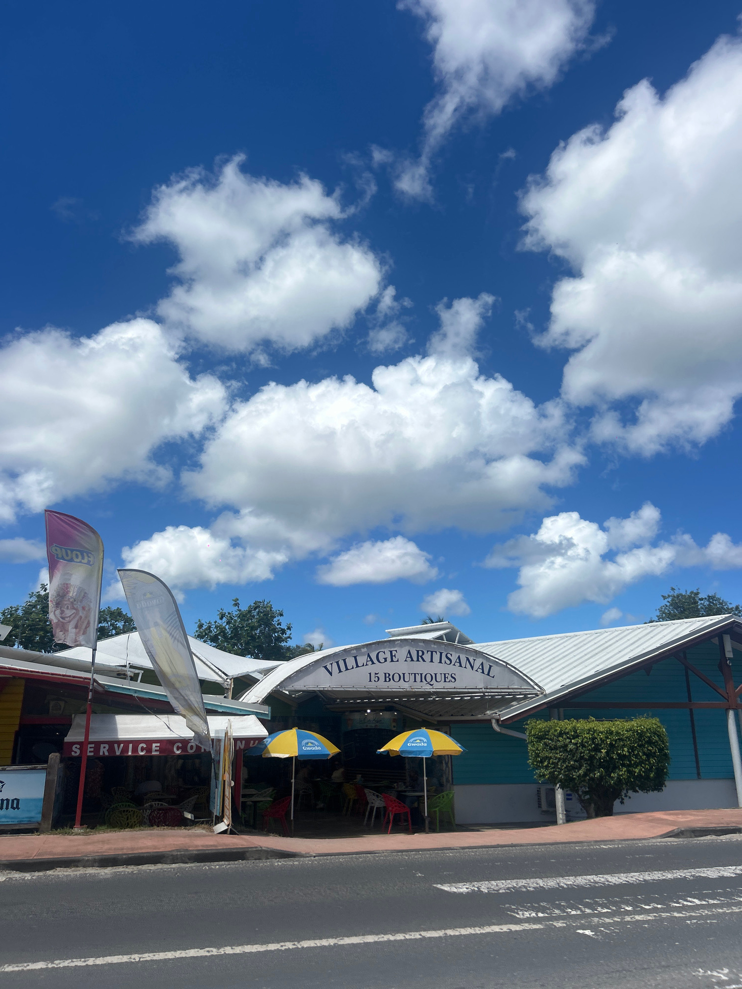 The image depicts the "Village Artisanal 15 Boutiques," a group of artisanal shops in Sainte-Anne, Guadeloupe, France. The shops are visible, with signs and flags displayed. The sky is blue and filled…read more