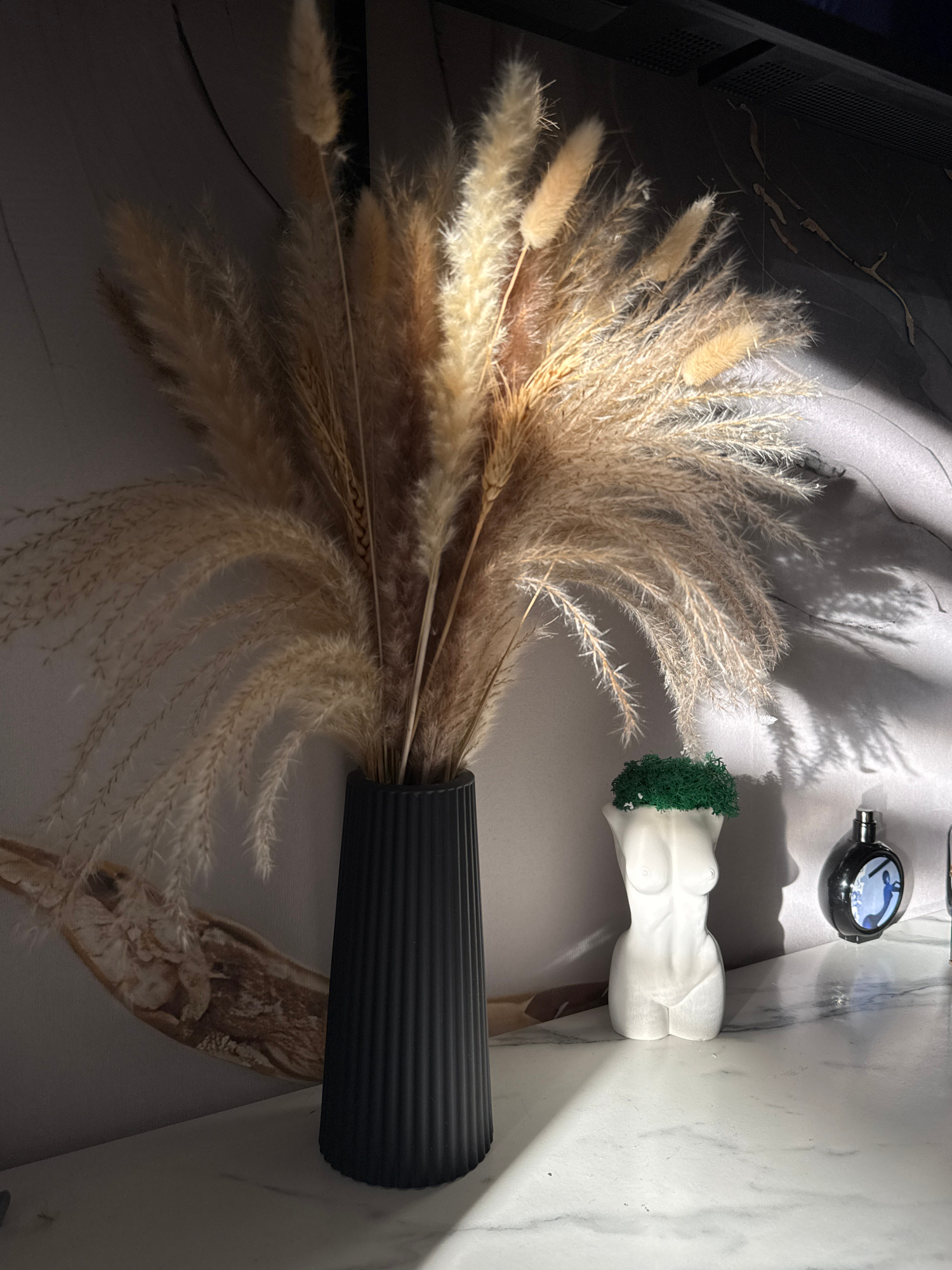 The image displays a still life arrangement on what appears to be a marble or marble-patterned surface. A black, ribbed vase holds a large bunch of dried pampas grass, which spreads out across the sur…read more