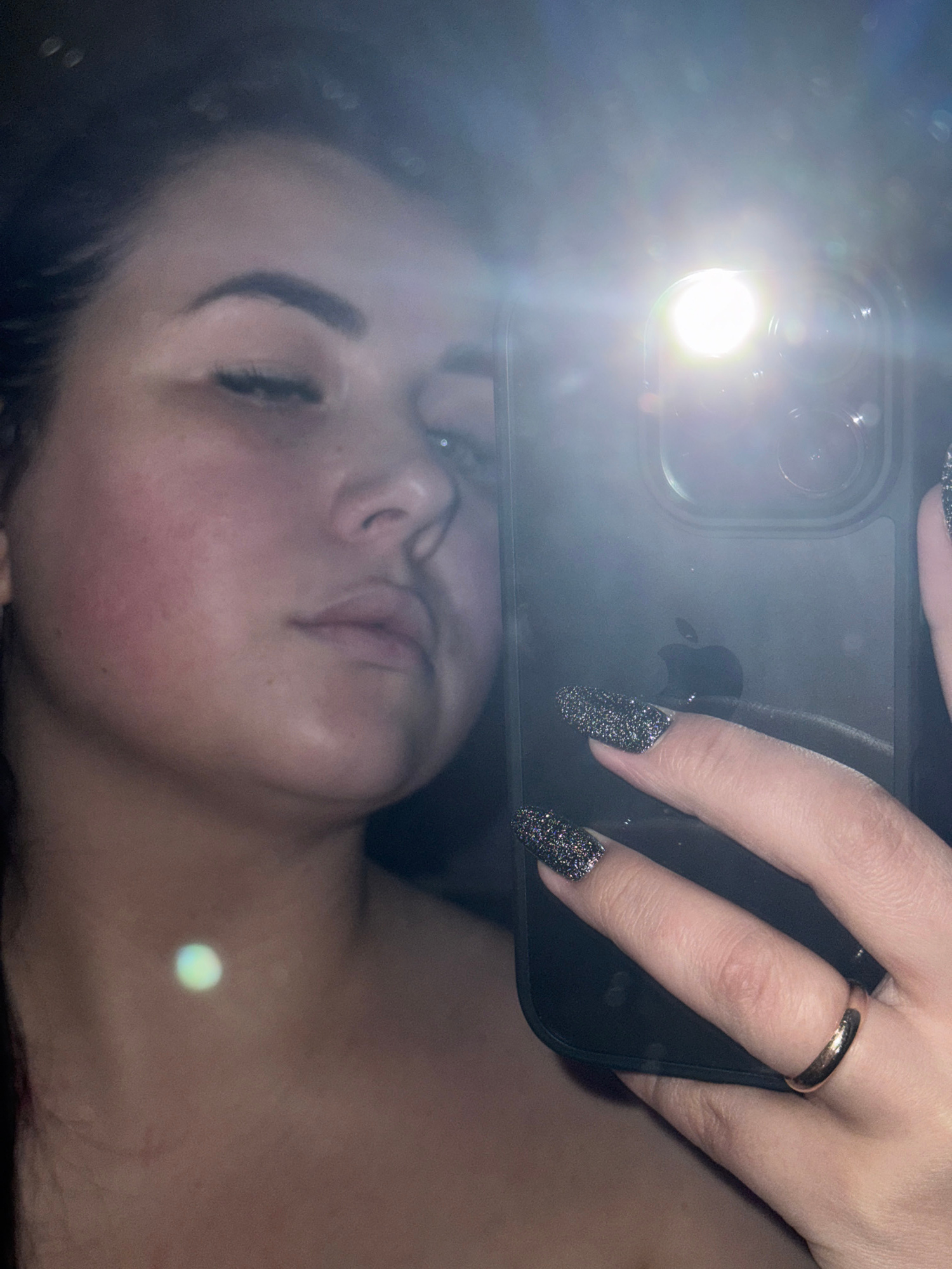 A woman is taking a selfie with a black smartphone. The phone's flash is on, causing a bright glare. She has dark hair and visible eyebrows. Her skin appears flushed. She's wearing a ring on her right…read more