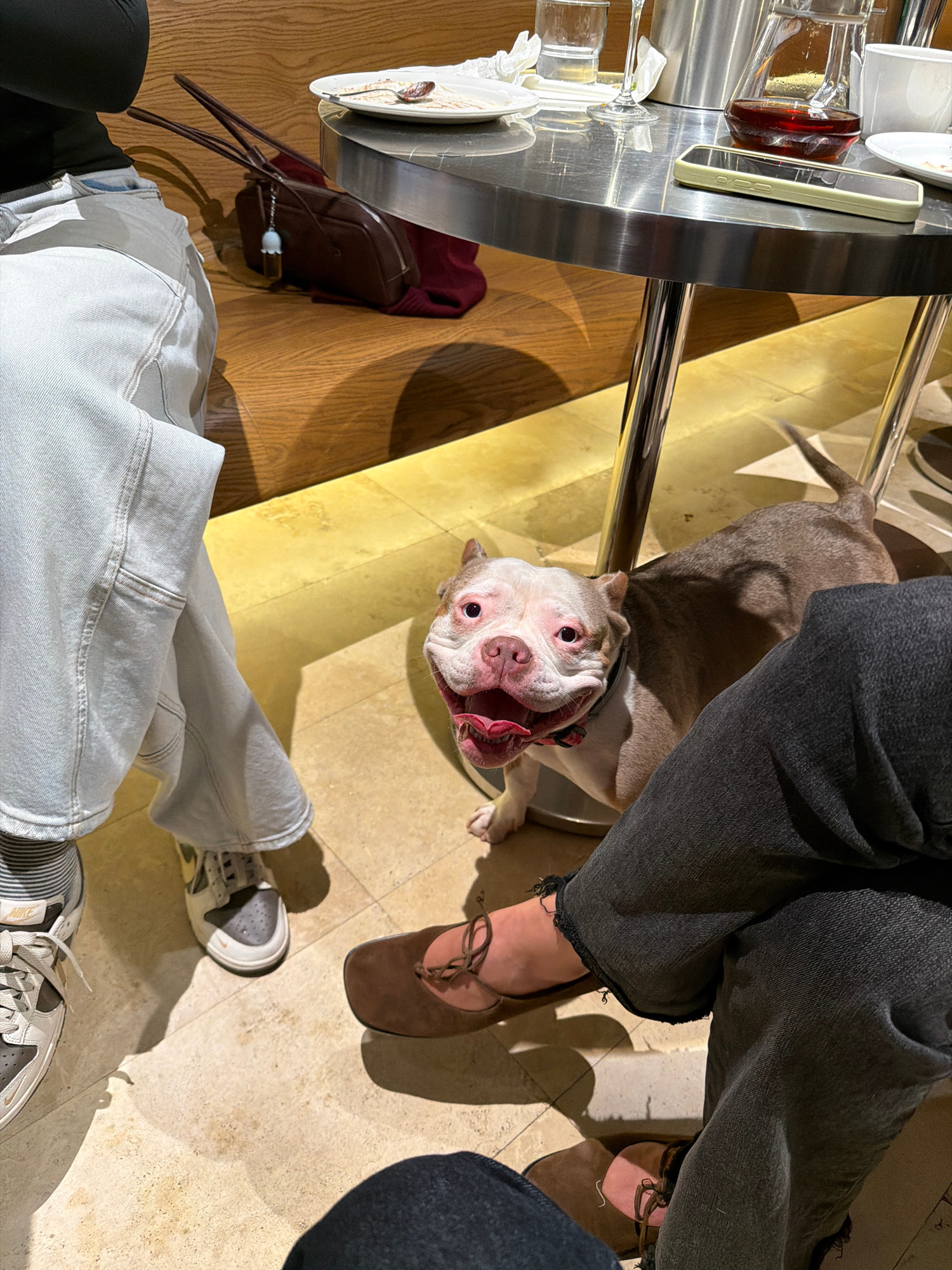 The scene is an indoor setting with a partial view of a stainless steel table on the left side, set with dining ware. A dog, with white and tan fur and pink skin, is positioned between two individuals…read more
