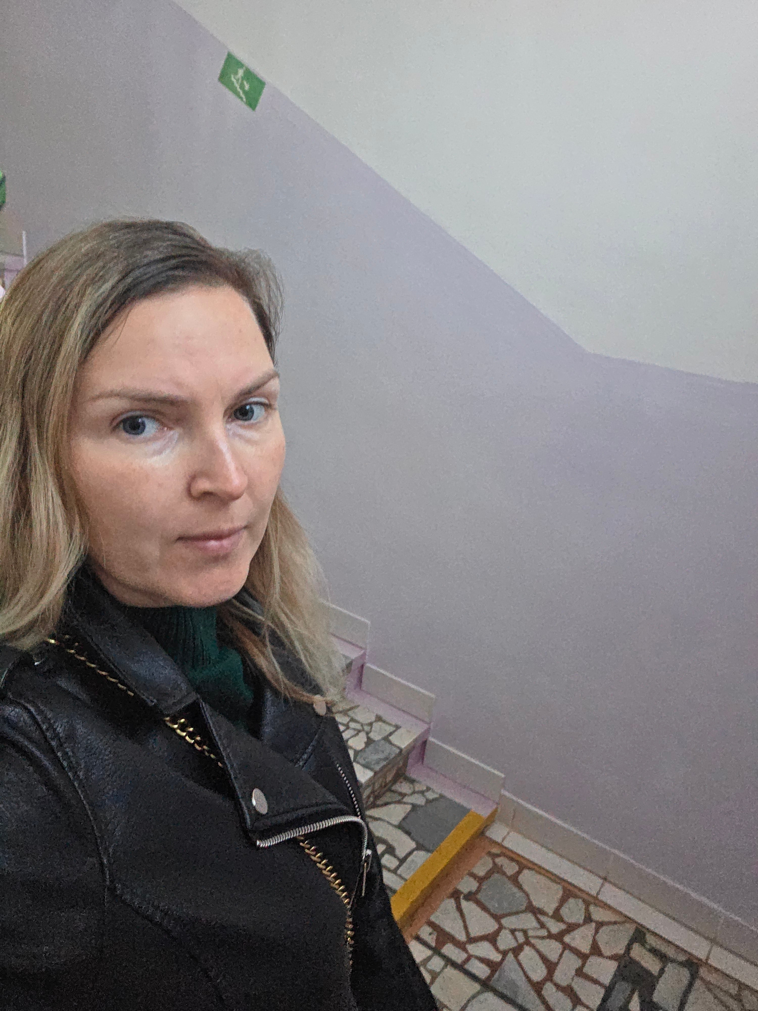 A woman with blonde hair and blue eyes is posing for a picture, wearing a black leather jacket over a green turtleneck sweater. She is standing inside a building, possibly in the city of Chaikovsky, R…read more