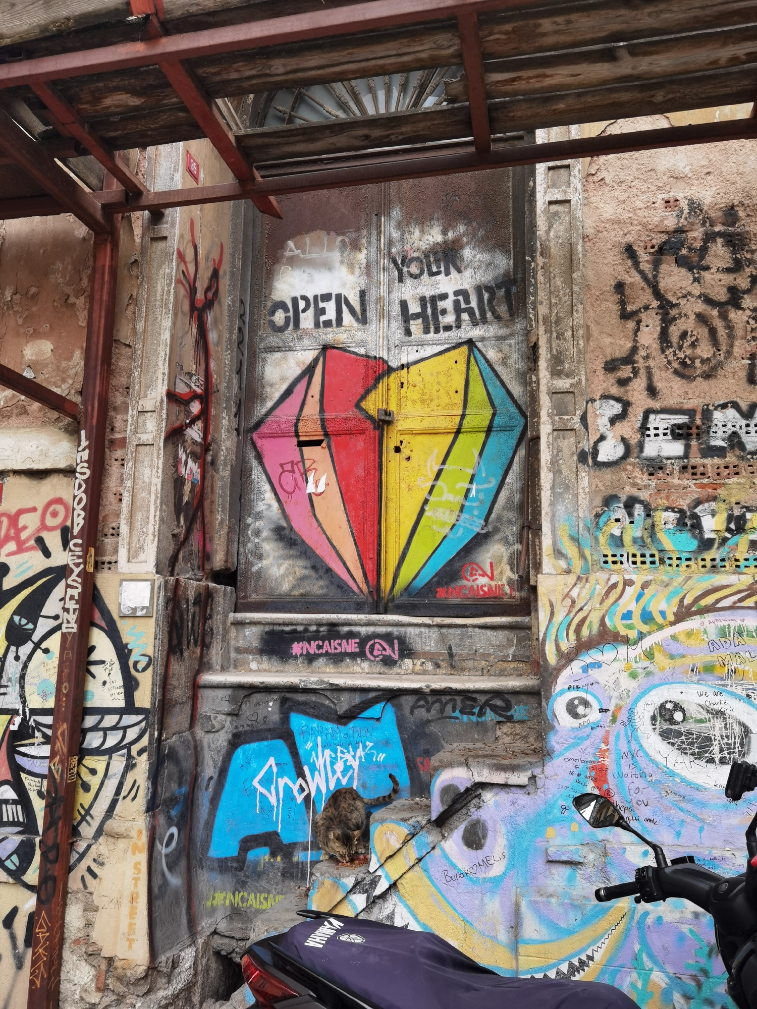 This image captures a vibrant and heavily graffitied urban scene, likely an alleyway or a narrow street, in Beyoğlu, Turkey. The central focus is a weathered, rusty metal double-door, adorned with a l…read more