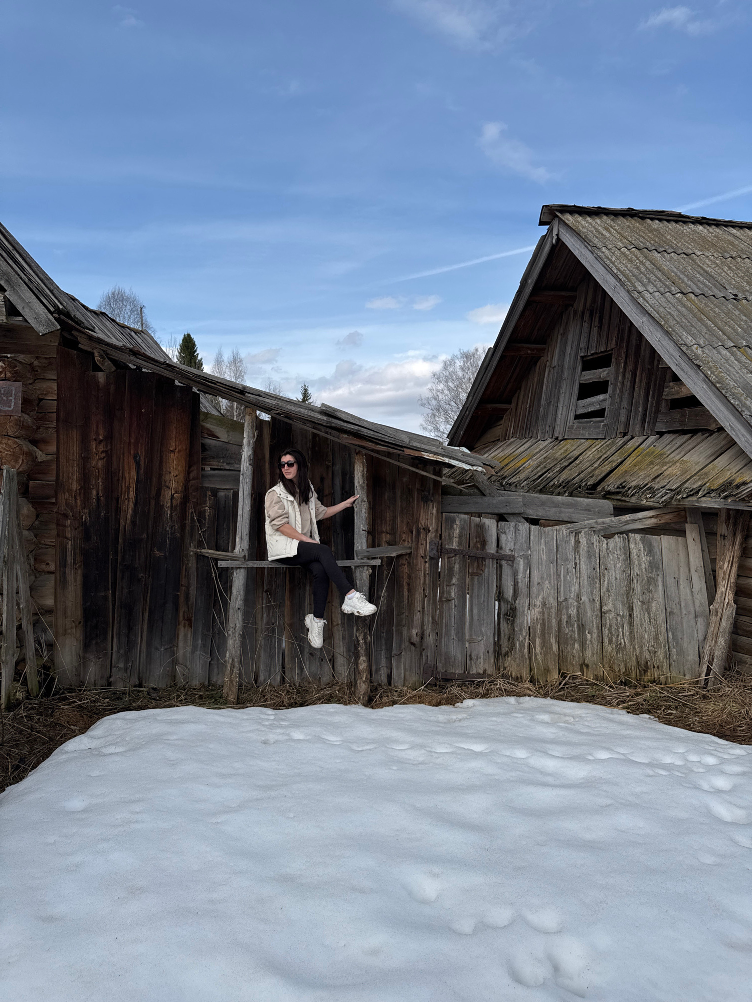 The photograph, taken in Вассята, Russia, depicts an individual suspended from a dilapidated wooden structure, possibly an abandoned building or shed. The person, wearing dark leggings, white athletic…read more