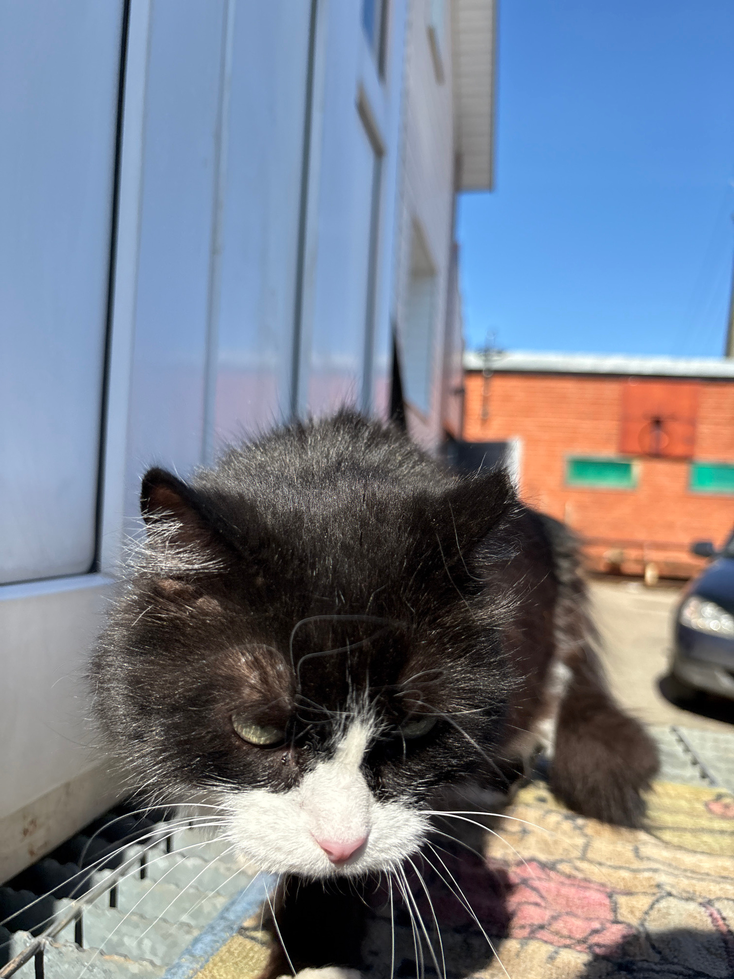 A close-up, tilted, eye-level shot depicts a black and white cat with long whiskers lying on a patterned surface outdoors. The cat's pink nose is visible. Behind the cat are a building with white sidi…read more