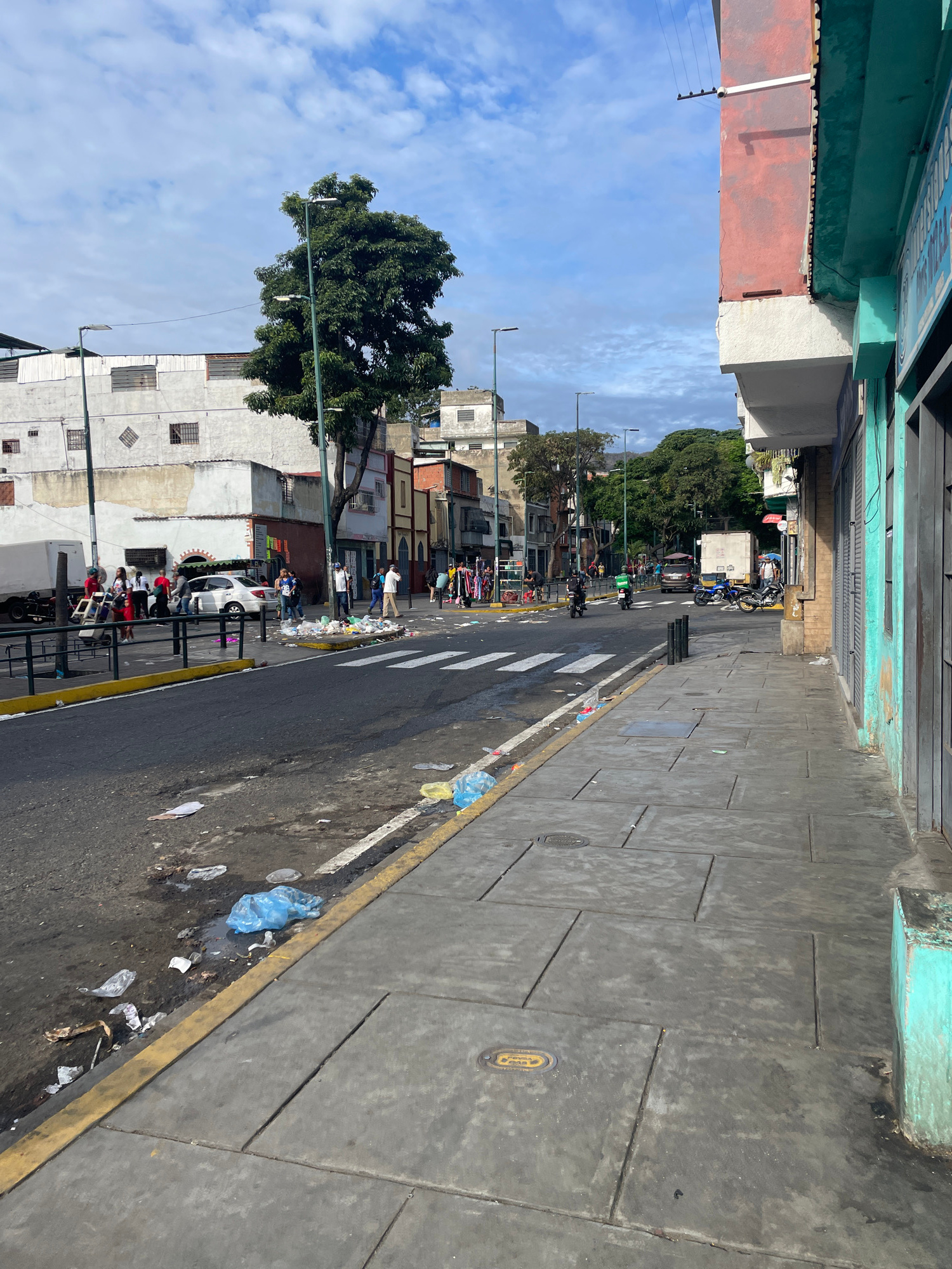 The image depicts a street in Caracas, Venezuela, with a sidewalk on the right and buildings on the left. There is litter and trash scattered along the curb of the street. A crosswalk is visible in th…read more