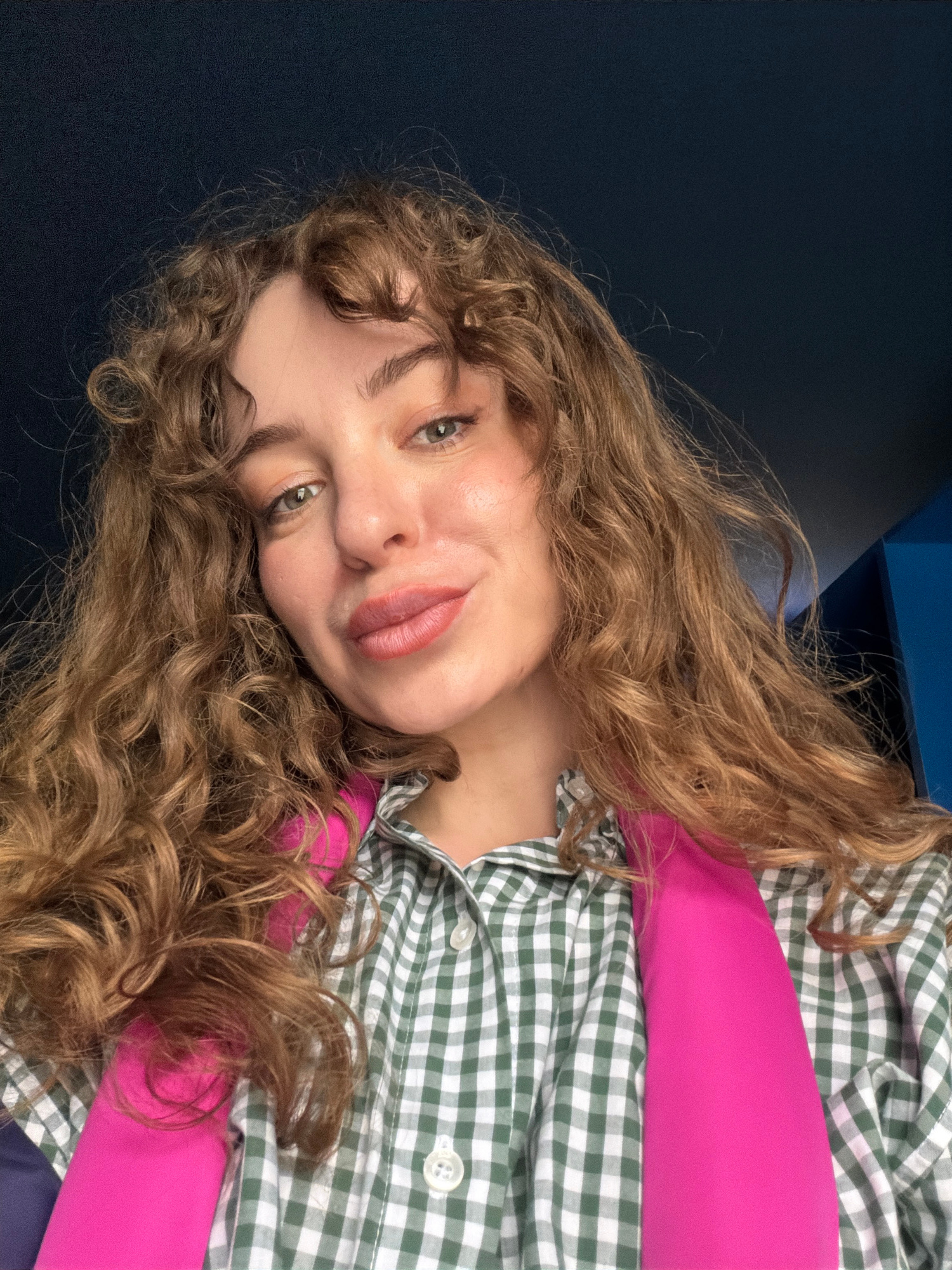 A woman with long, curly, light brown hair, fair skin, and light-colored eyes is lying on a dark blue surface. She is wearing a green and white checkered button-down shirt over a bright pink top. The…read more