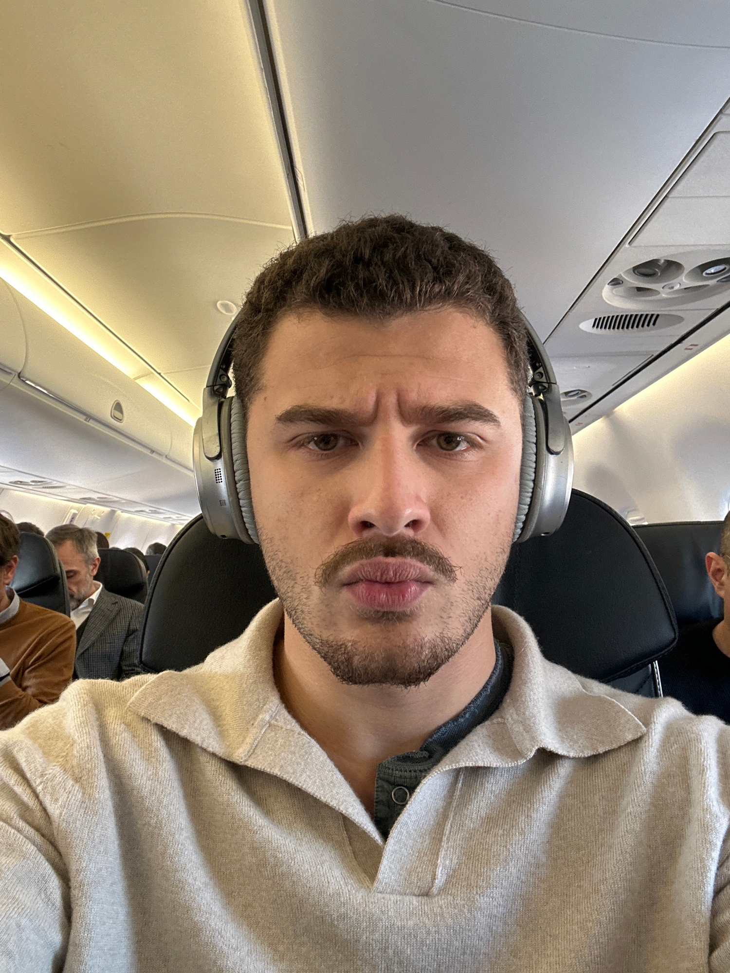 The image displays the interior of an aircraft cabin. In the foreground, a male individual is positioned centrally, facing directly towards the camera. He possesses short, dark brown hair, a trimmed m…read more