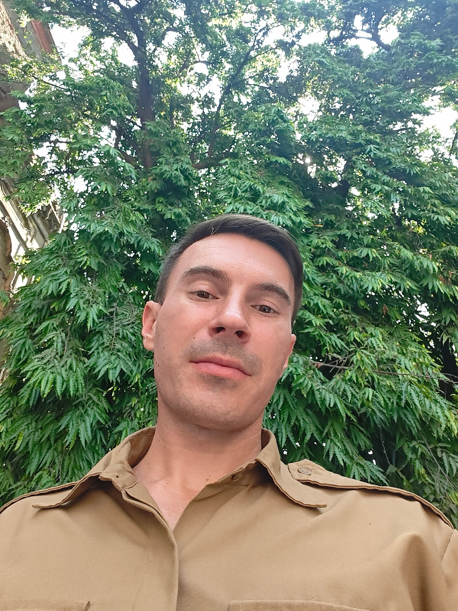 A medium shot, taken from a low angle, features a man in a tan button-down shirt against a backdrop of dense green foliage. The man, who appears to be in his late 30s or early 40s, has short, dark hai…read more